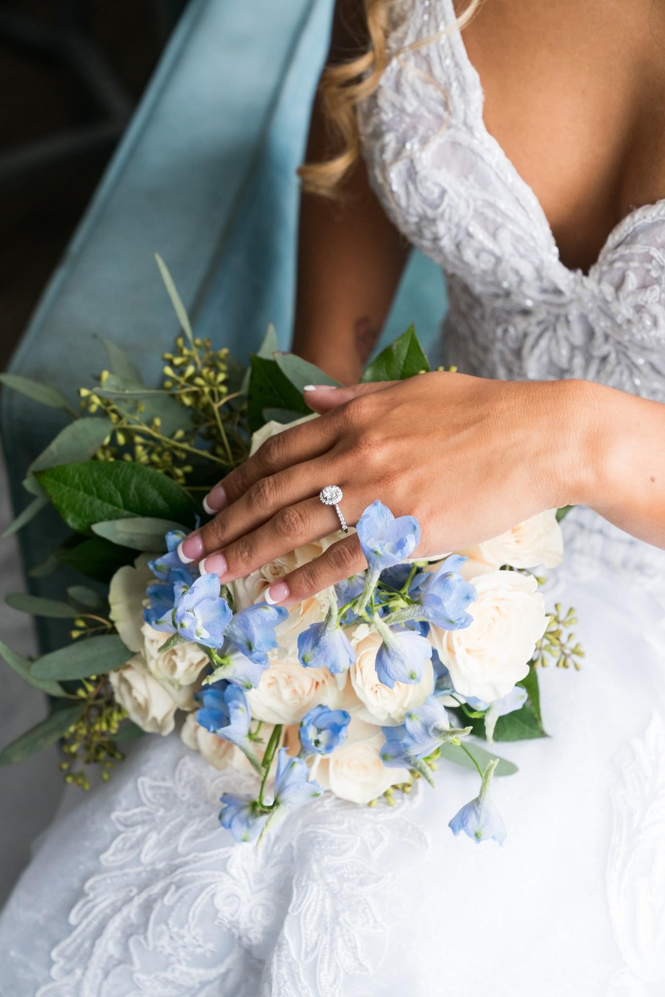 For their nautical-themed wedding on June 24, 2023, Fran and Brian incorporated blue throughout the big day. The bridesmaids wore dusty blue dresses. The men wore boutonnieres with white roses and a sprig of light blue delphinium. Fran’s flowers were white roses with seeded eucalyptus with a touch of light blue delphiniums. “I also had a beautiful charm I had purchased on Amazon to honor my cousin that passed away and couldn’t be with us,” says Fran.