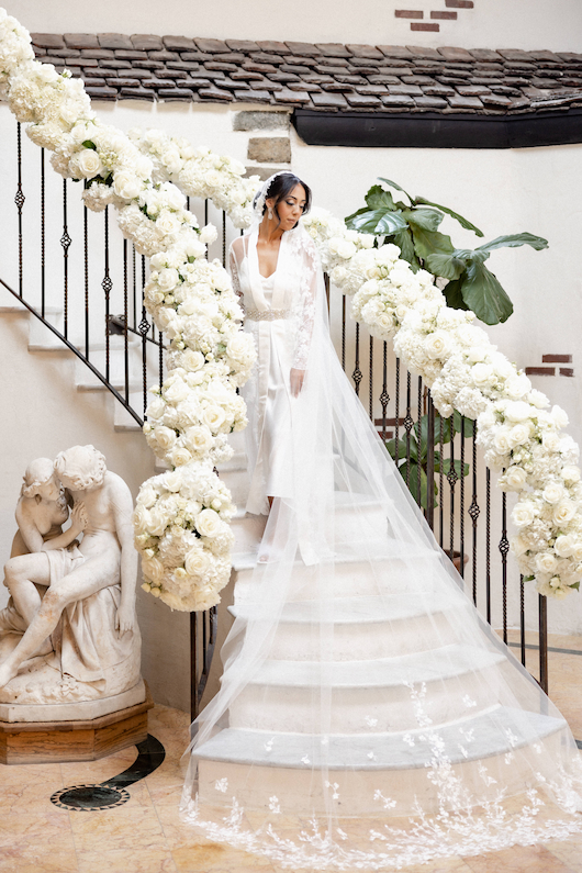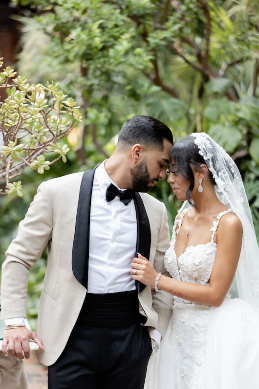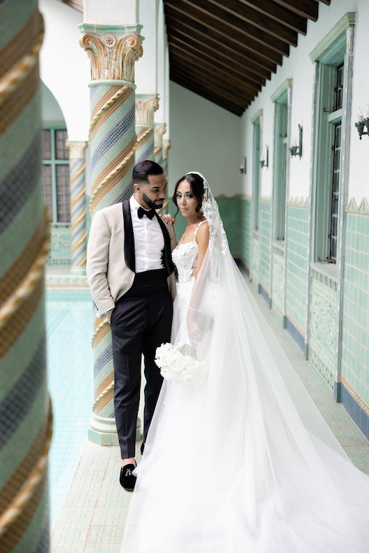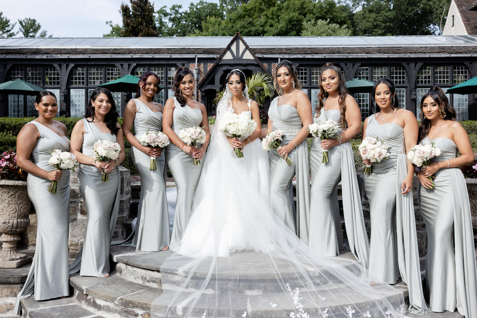 After visiting many stores, Gabby was feeling discouraged. She was about to leave Vera’s Bridal in Englewood after trying on a selection of dresses, when the stylist came over with one more gown that Gabby’s mom had picked out. “When people say ‘you’ll know’ they were not wrong,” says Gabby. In particular, she loved the 3D floral applique. “I had originally wanted to wear two dresses, but I loved this one so much that I didn’t want to change,” she says. After some further brainstorming, Gabby decided to add a custom skirt. She also opted for a mantilla veil that laid on her head without a comb.
