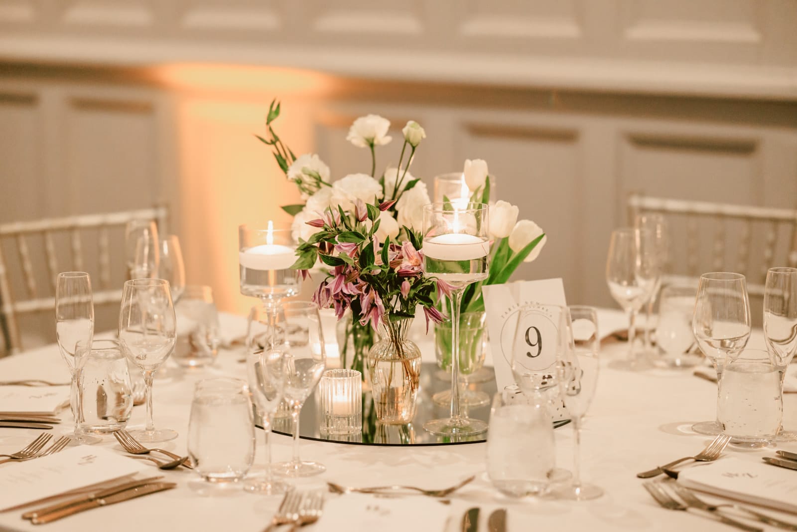 As for flowers, Halle wanted “white florals with a cool twist,” a vision that Karma Florals executed flawlessly. “The Karma team came up with the bud vases with purple accents, and it was perfect,” Halle says.