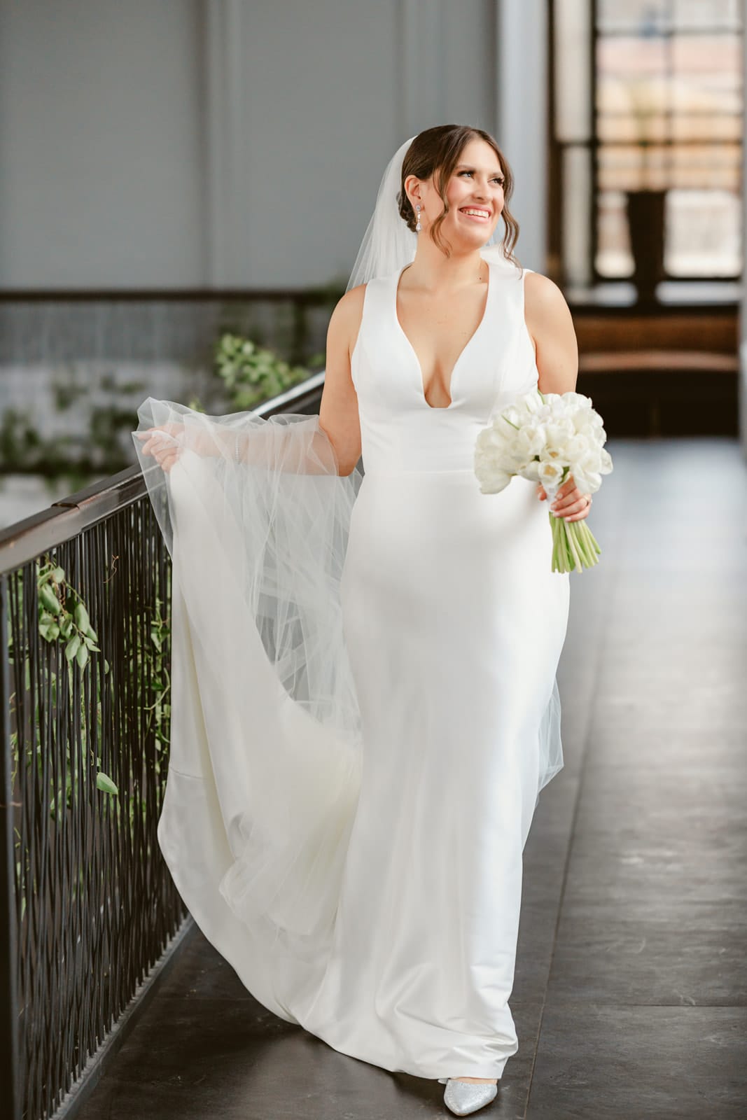 Halle wore a classic and simple deep-v fit-and-flare Justin Alexander dress, which she bought at RK Bridal. “I went in knowing I wanted a bow, which to me felt like the perfect small feminine touch to a classic dress,” the bride says. “I went in wanting a timeless gown, and that is definitely what I bought.”