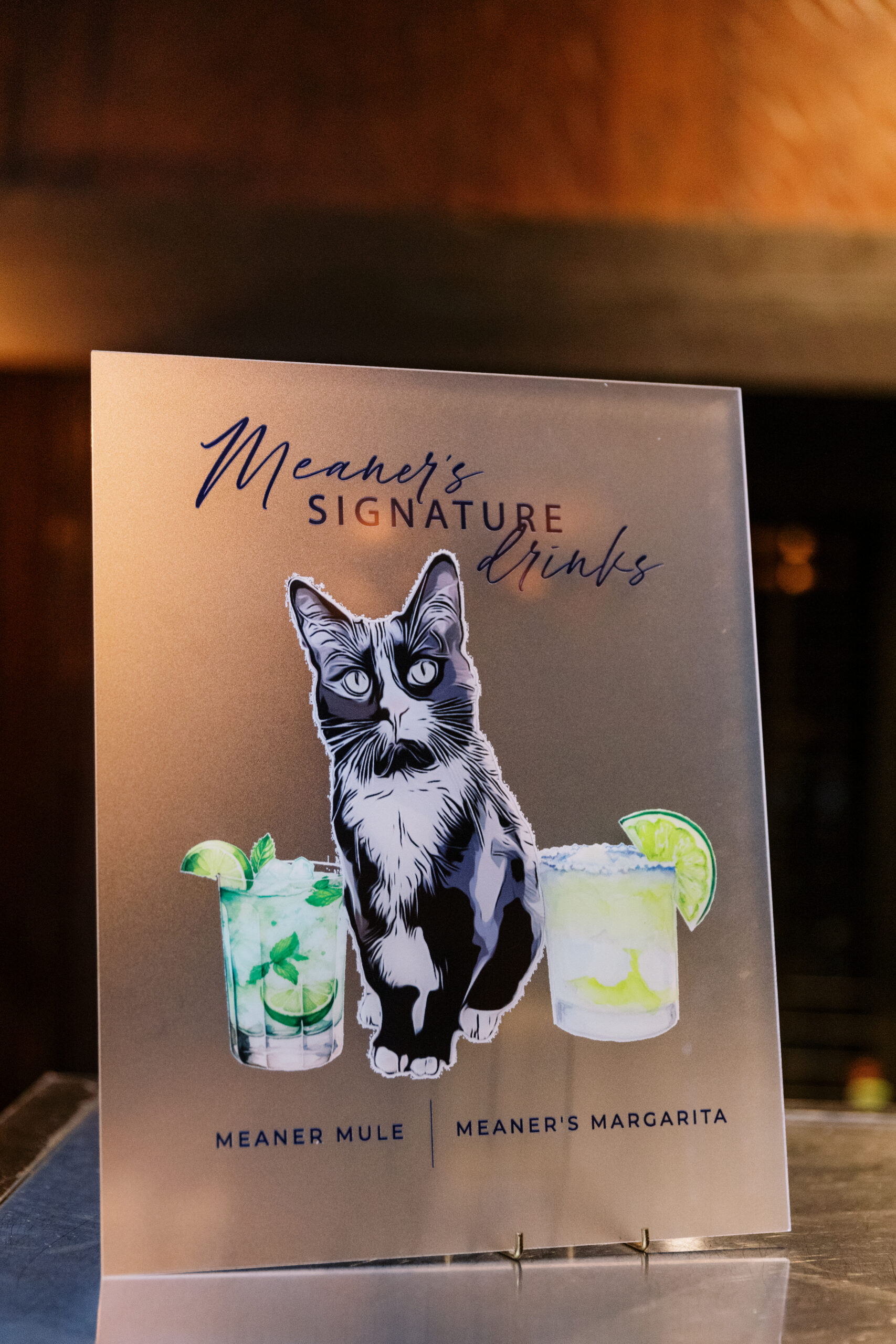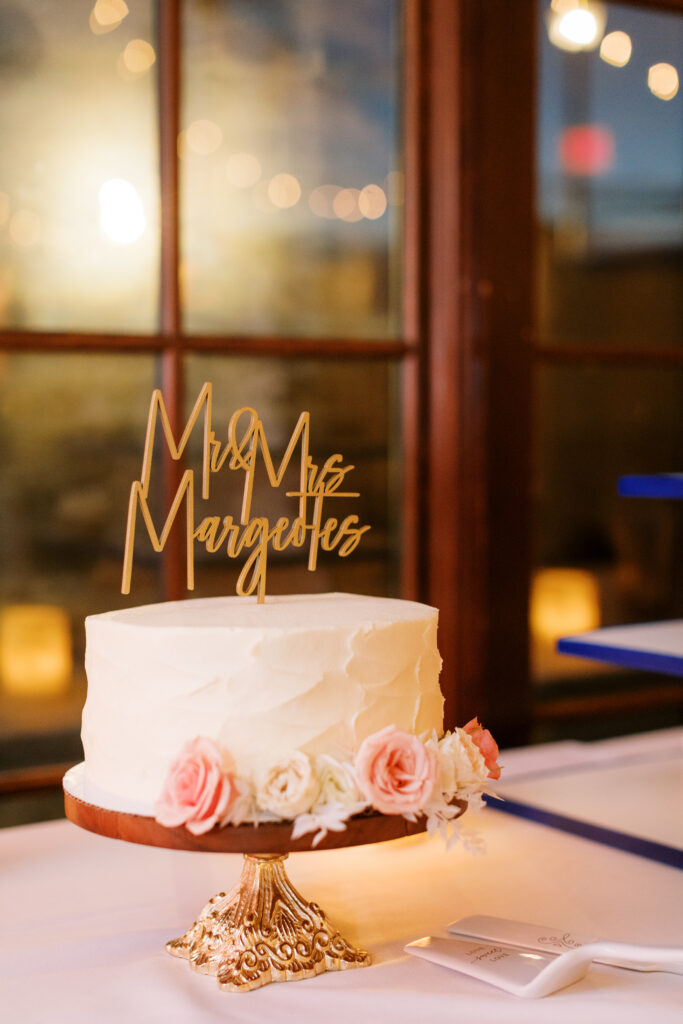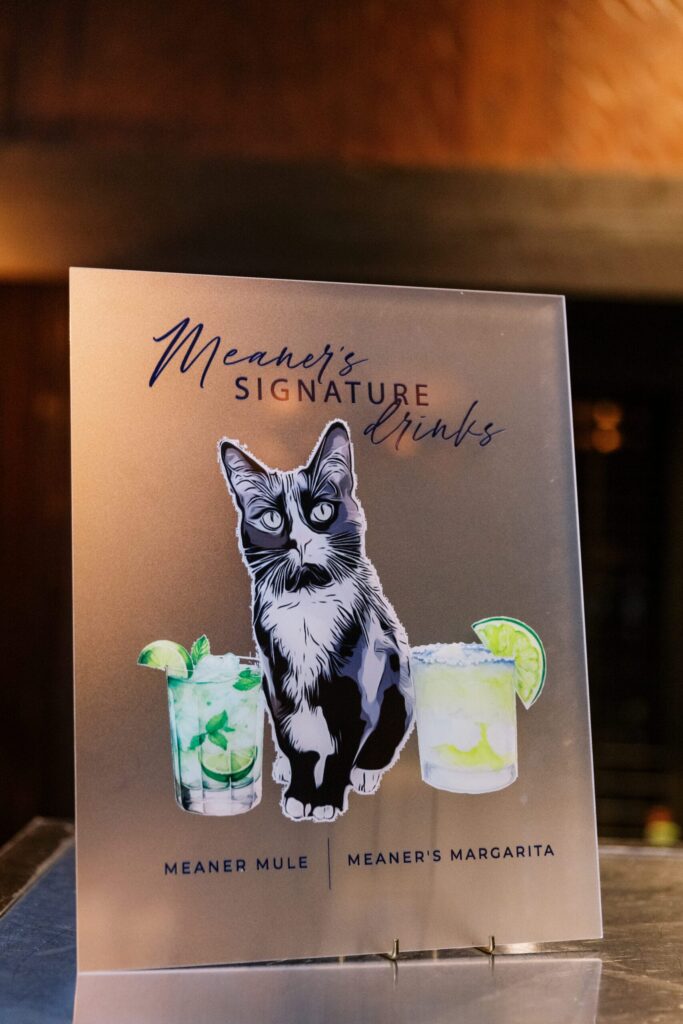 Lake Mohawk’s in-house catering—featuring abundant cocktail hour offerings—was “so good people were talking about it later,” recalls Shanice. For dessert, the couple served carrot cupcakes from Maplewood favorite the Able Baker. Jason’s family are the longtime proprietors of Holsten’s, a confectionary and ice cream shop in Bloomfield famous for being the site of The Sopranos finale. Their chocolate-covered pretzels accompanied the cakes on the dessert bar, and guests left with Holsten’s chocolate lollipop favors. Custom cocktails and napkins honored the couple’s cats, Meaner and Ratzen.