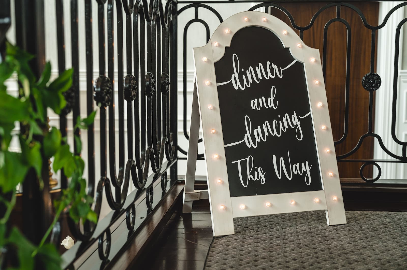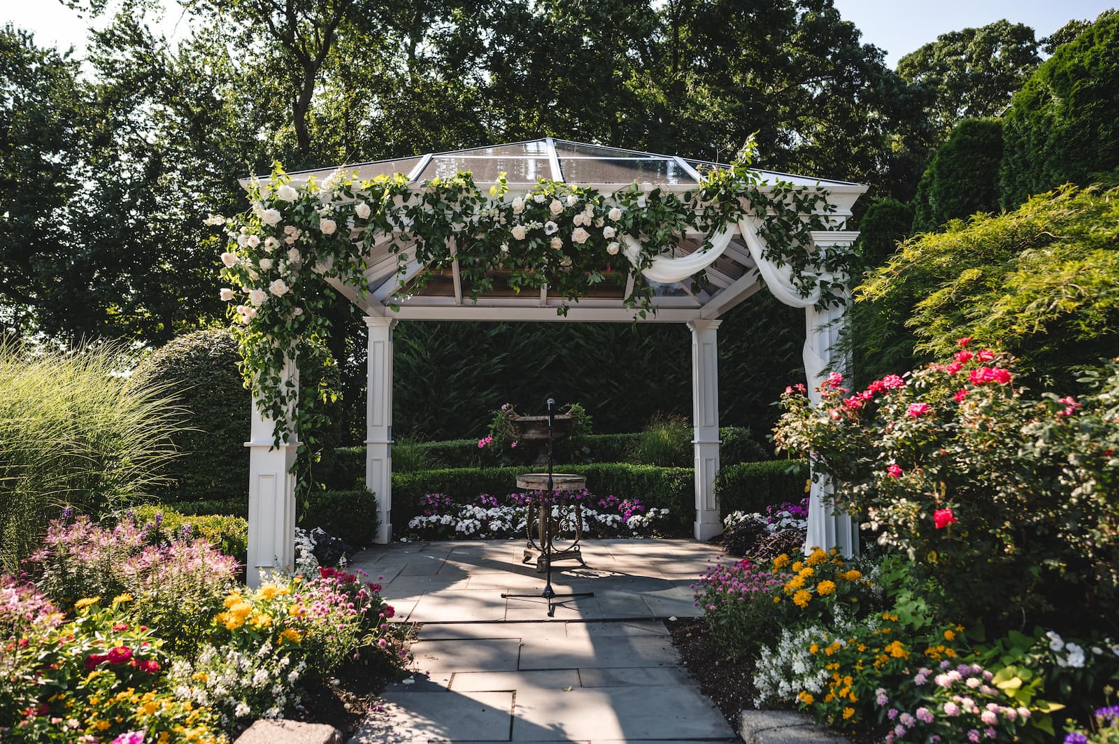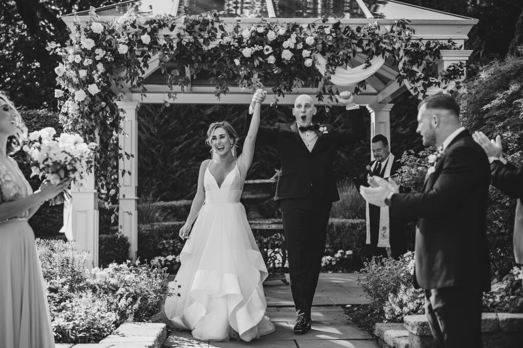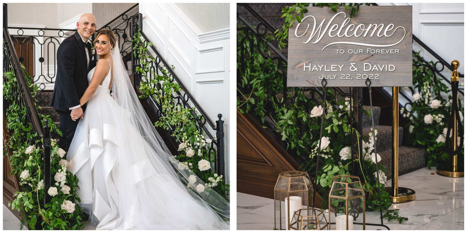 For their July 22 wedding, Hayley was aiming for an atmosphere that was formal and classic while also incorporating a whimsical garden vibe. The flowers for the ceremony were all white with lots of greens, and the installation atop the gazebo they got married under captured the dreamy romantic garden vibe Hayley envisioned. The bouquets, bud vases, centerpieces and installations were a mix of light summer florals combined with lots of organic looking greens. Their mirrored white framed seating chart was set up with their wooden welcome sign, amongst lots of candles and white lanterns in the foyer. Their beautiful ballroom with wrap-around windows, incorporated a mix of high and low centerpieces with flowers spilling over and lots of candles to feel whimsical and romantic. “My favorite detail we incorporated in our day was a ‘Generations of Love’ table set up right when you walked in from the ceremony that showcased the wedding photos of both our grandparents and parents,” says Hayley. The couple’s first dance song was “Conversations in the Dark” by John Legend and Hayley walked down the aisle to “Beauty and the Beast.”
