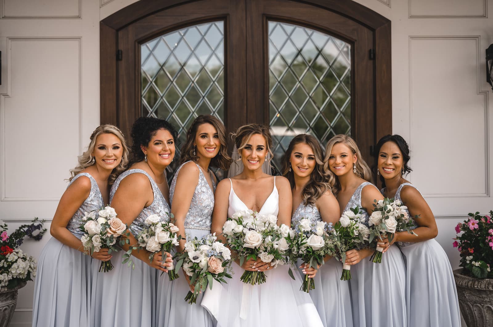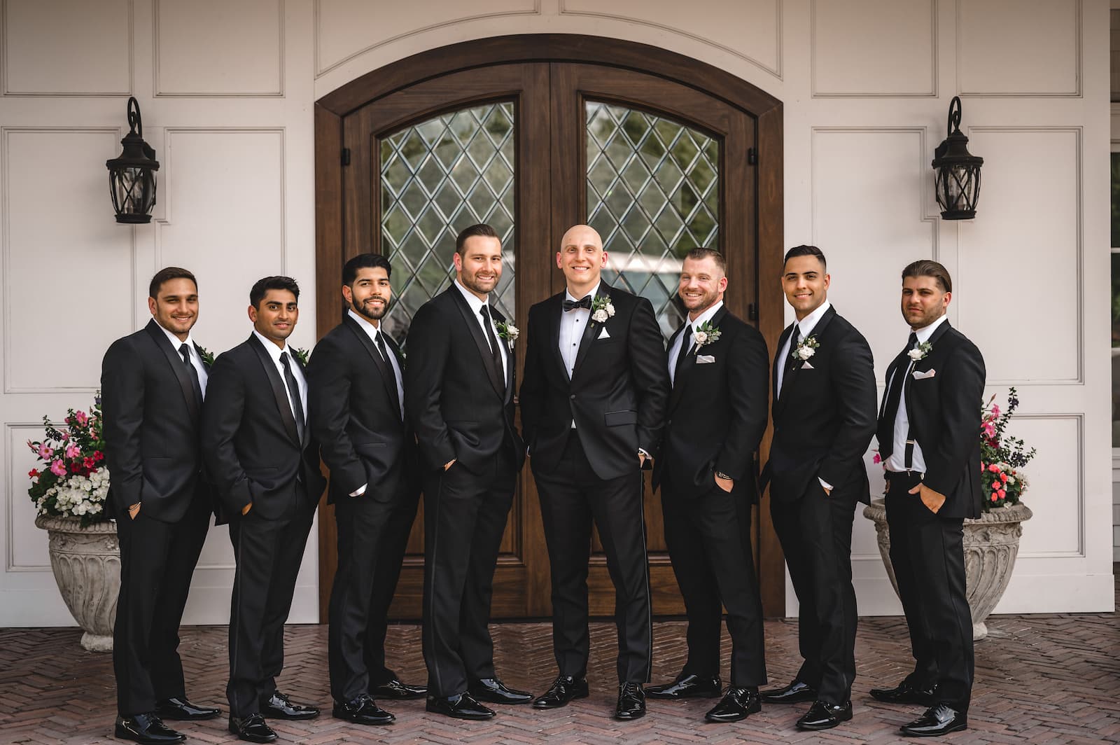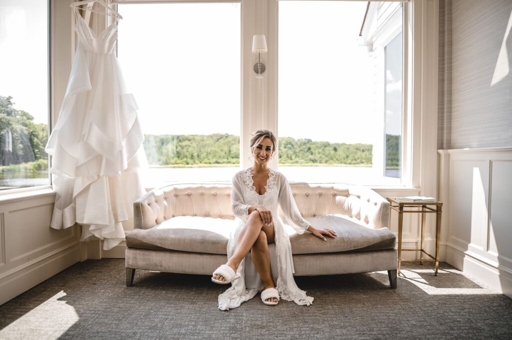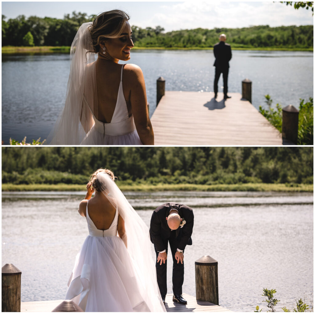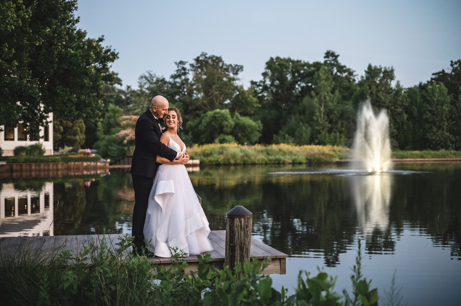 The Mill Lakeside Manor was the perfect waterside venue for Hayley and Dave. “The beautiful ballroom overlooking the lake, paired with the lakeside garden ceremony space, were exactly what we were looking for,” says Hayley. “The classic black-tie wedding that I wanted with a summery feel down the shore was exactly what The Mill delivered.” Hayley loved the set up out back: a beautiful dock, patio and deck that all of their guests could enjoy. Inside, the cocktail hour space is spacious and airy with a stunning fireplace and giant wrap around bar. The groom’s suite is swanky and cool, and the bridal suite is breathtaking as it overlooks the running mill and lake. “When the doors opened, and Dave and I entered the room as the sun was starting to set over the lake, I knew we’d picked our perfect venue,” says Hayley.