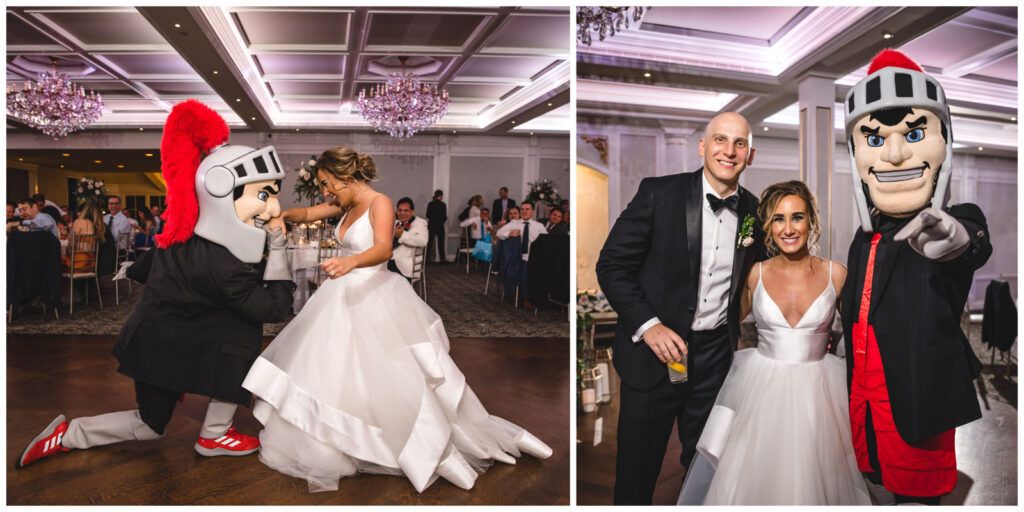 “Rutgers is so meaningful to us. We got the surprise of a lifetime when my family had THE Scarlet Knight, Sir Henry, come to our wedding,” says Hayley. “The band announced that we wouldn’t all be here today without one very special guest. Dave and I looked at each other completely confused as to who it could possibly be. When the Scarlet Knight walked in, dressed in a suit for the occasion, we couldn’t believe it.” Both of their fathers, several family members and tons of friends at the wedding are Rutgers alumni, too. “Everyone absolutely loved it, and Sir Henry brought out the moves, making his way around the dance floor,” says Hayley. “It was the best surprise two alumni who fell in love at Rutgers could have at their wedding!”