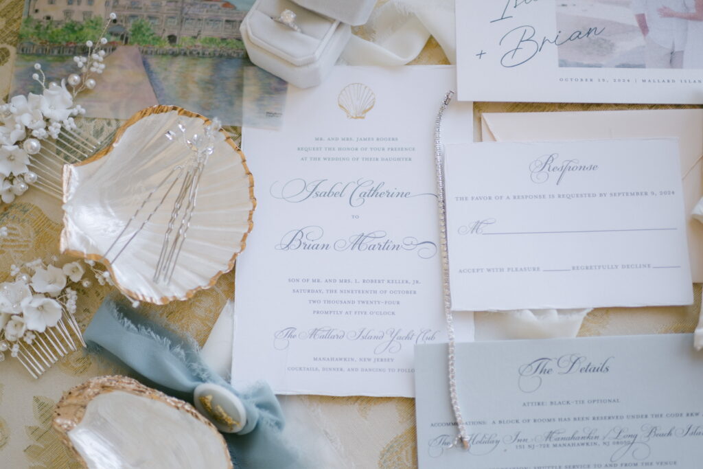 “I wanted my autumn beach wedding to incorporate beautiful and neutral shades of blues, grays and whites that were also fitting for the season,” says Isabel. “I’m a big fan of a minimalist and chic coastal look so we had shell and other ‘beachy’ motifs displayed on the invitations, menus and signage.”