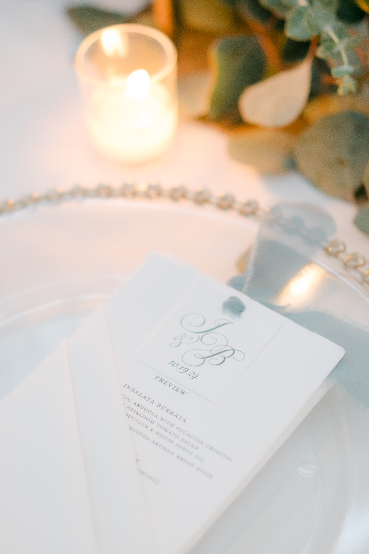 “I wanted my autumn beach wedding to incorporate beautiful and neutral shades of blues, grays and whites that were also fitting for the season,” says Isabel. “I’m a big fan of a minimalist and chic coastal look so we had shell and other ‘beachy’ motifs displayed on the invitations, menus and signage.”