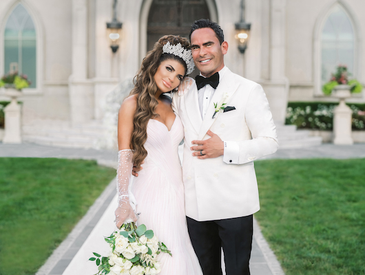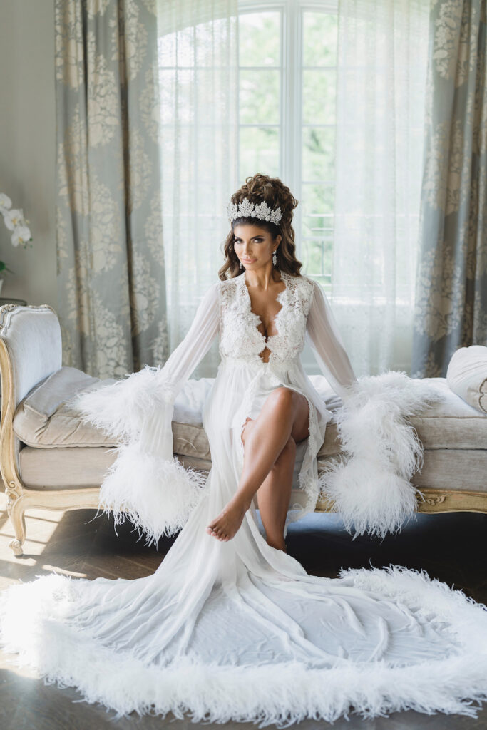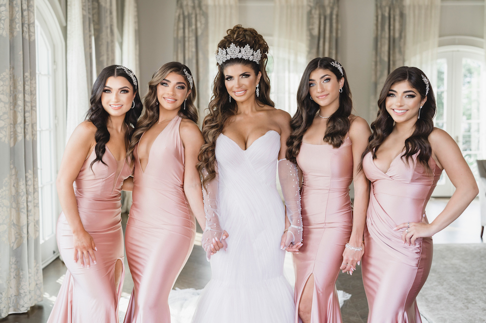That extended to every element of planning, including Teresa’s dress choices. For the ceremony, Teresa wore a custom Mark Zunino Atelier blush mermaid gown, which was fitted through the body and flared at the bottom. But for the reception, the TV star wanted to be able to move freely all night without a shred of discomfort. She chose designer Galia Lahav’s Gaga gown, an ethereal creation with a sexy, off-the-shoulder corset top and a voluminous skirt made of ice pink and ivory lace.