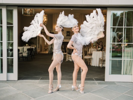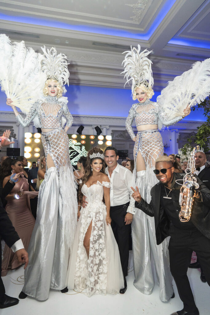 During the reception, guests boogied to music from a 16-piece band provided by Jordan Kahn Music Company and a DJ from Geo Events later in the evening. Jordan Kahn also put together an extravagant display of live, immersive entertainment. Sultry burlesque dancers stripped down to nearly nothing, aerialists showed off their impressive moves, a sword swallower provided some dangerous fun, and stilt walkers in metallic suits strutted across the dance floor. The couple also enlisted drummer Tito Puente Jr., a childhood friend of Louie’s and the son of famed musician Tito Puente, and saxophonist Art Crichlow to play more terrific tunes.