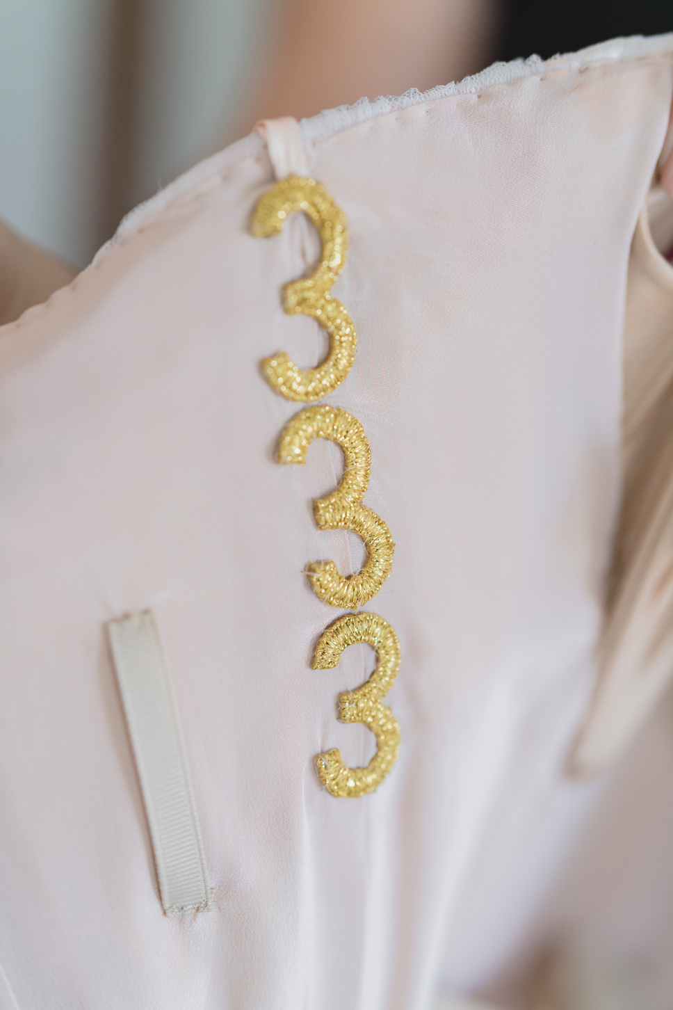 Inside Teresa’s ceremony gown, Mark Zunino embroidered three pink hearts because she and Louie both love hearts, and 333 because the number 3 is significant in Teresa’s family.