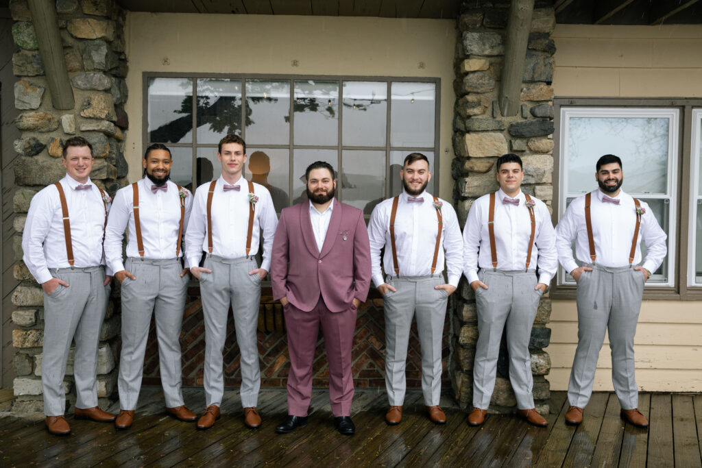 For their May 5, 2024, wedding, “we had more of a rustic theme,” says Jacalyn. “No flowers, all succulents besides the boutonniere and corsages. Our color palette was dusty rose, vintage mauve and green. The groom was in a dusty rose suit while the groomsmen were in grey pants, a white button up and suspenders and the bridesmaids matched the groom. Our favors were a to-go station of chicken fingers, French fries and pizza bagels. Our tables were mixed with round and barn tables so we had two different centerpieces. The barn tables had dusty rose pink cloth going down the center with greenery on top and candles and the round tables had wooden lanterns with greenery on top.”