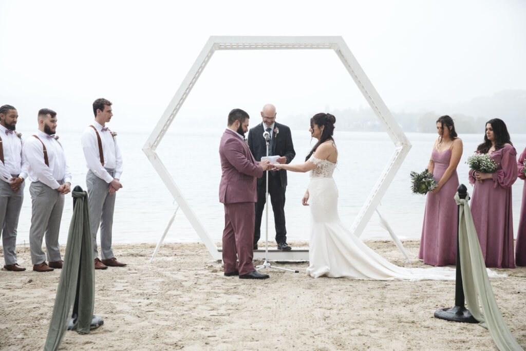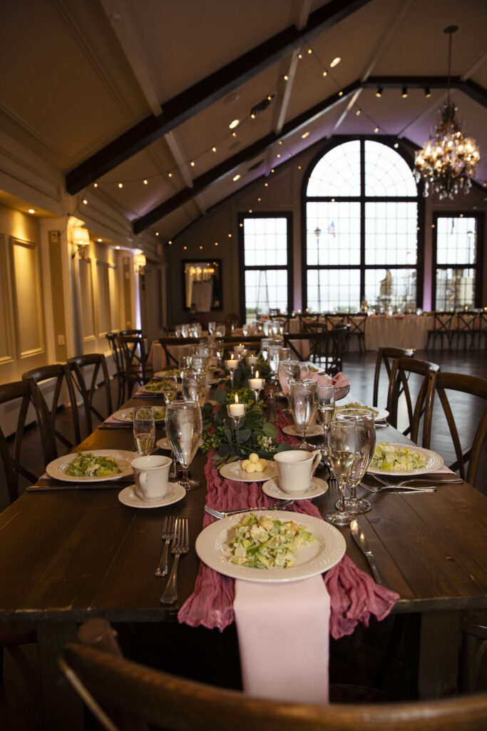 “We wanted either beachy or rustic,” says Jacalyn. “We looked at a few different venues and then when we walked into the reception room of Lake Mohawk Country Club, my stomach dropped and I was set. Then seeing the beach and the boardwalk, it was all perfect. Everything we wanted in one place.”