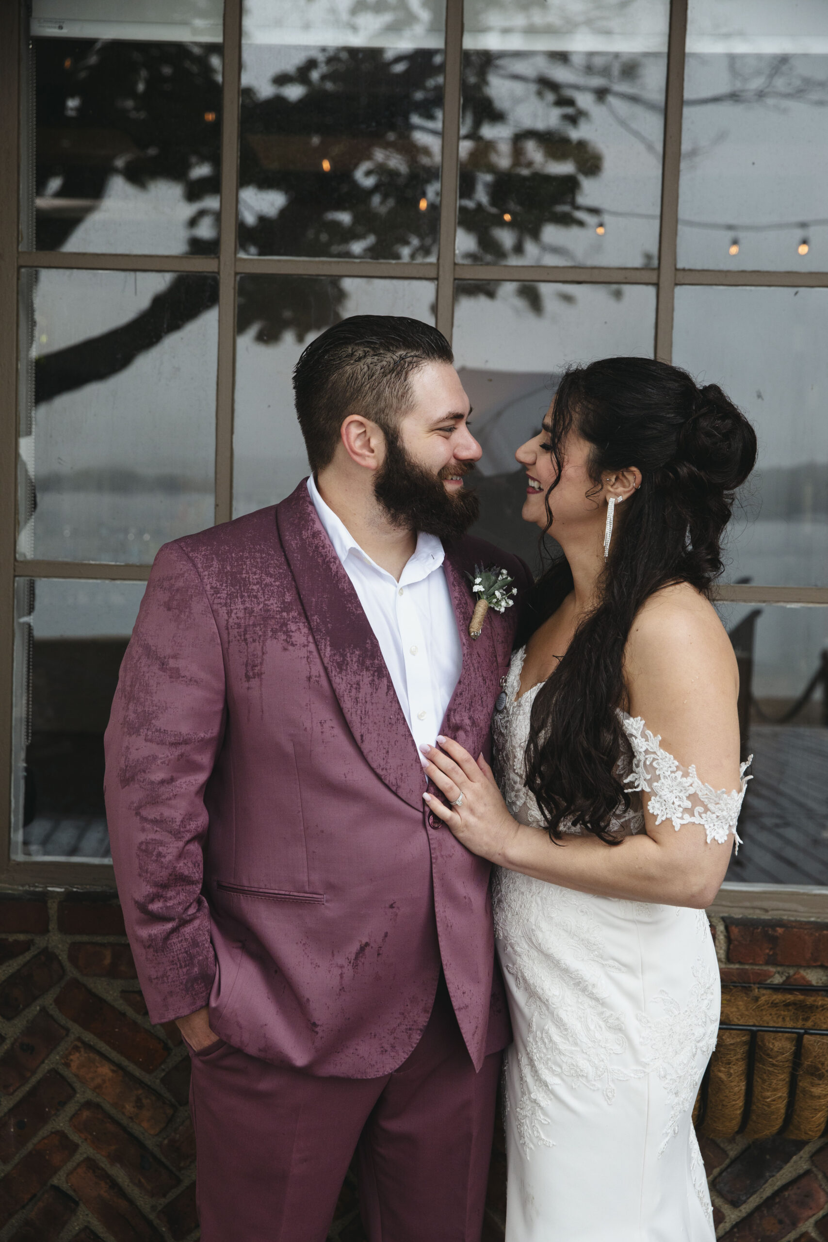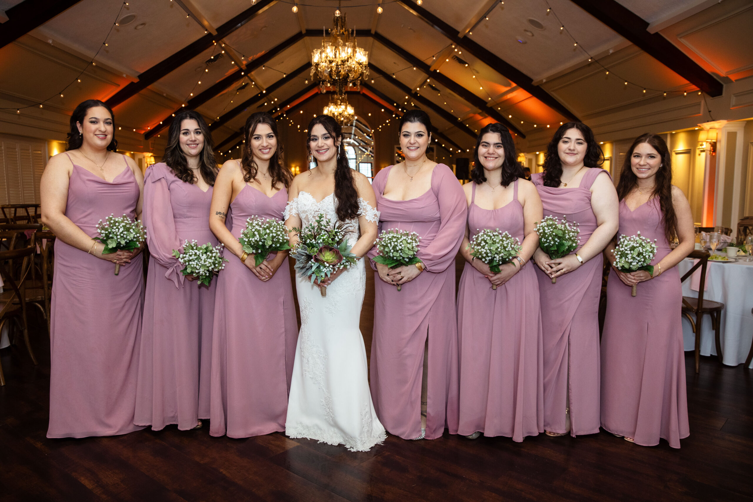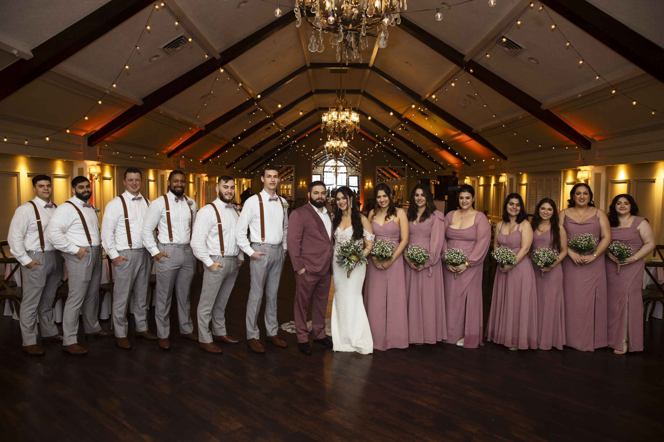 For their May 5, 2024, wedding, “we had more of a rustic theme,” says Jacalyn. “No flowers, all succulents besides the boutonniere and corsages. Our color palette was dusty rose, vintage mauve and green. The groom was in a dusty rose suit while the groomsmen were in grey pants, a white button up and suspenders and the bridesmaids matched the groom. Our favors were a to-go station of chicken fingers, French fries and pizza bagels. Our tables were mixed with round and barn tables so we had two different centerpieces. The barn tables had dusty rose pink cloth going down the center with greenery on top and candles and the round tables had wooden lanterns with greenery on top.”