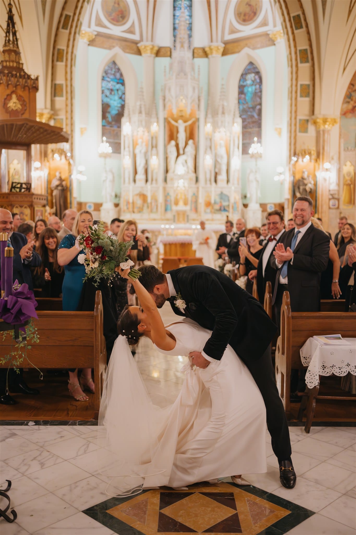 The colors were wintry, Lauren’s dress had a big bow, the bridesmaids wore a mix of burgundy reds in different textures (velvet, tulle, satin, sparkles, ruffles).