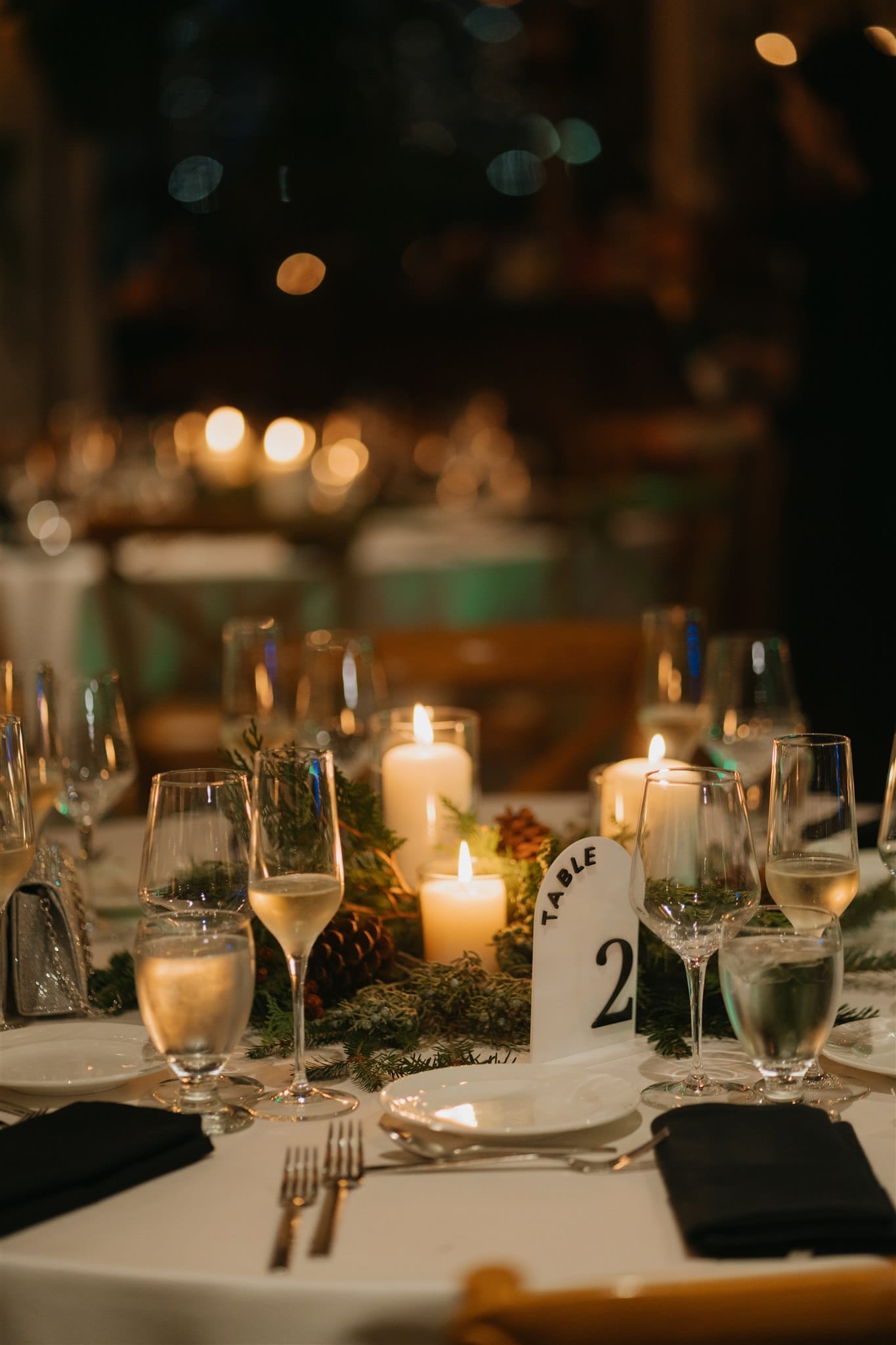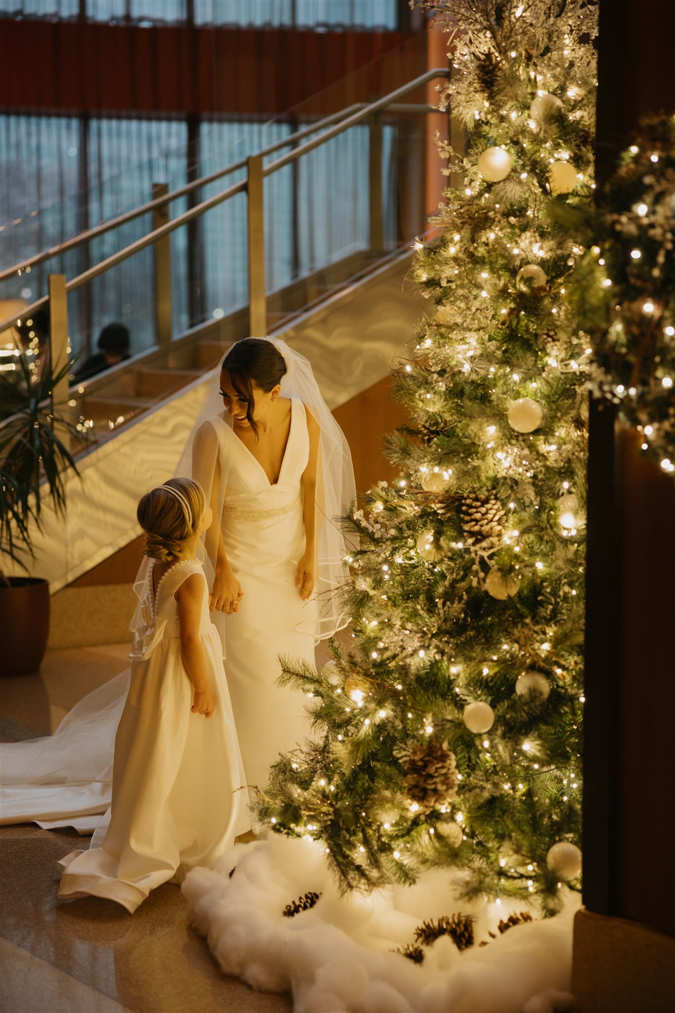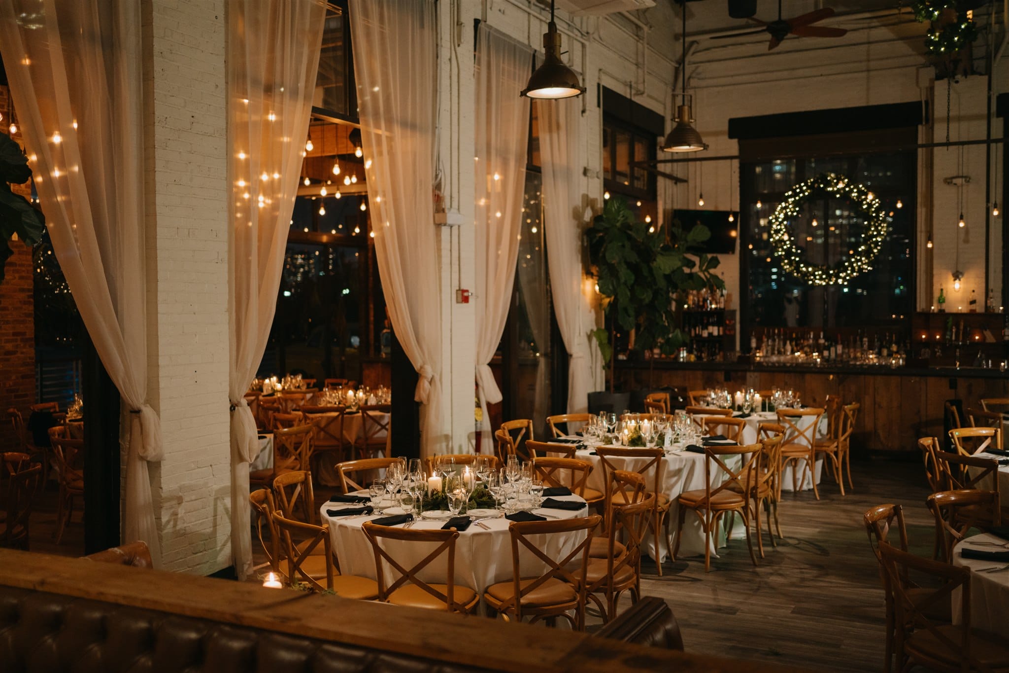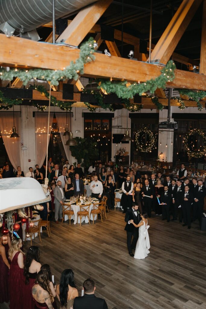 “For flowers we did a lot of greenery on the tables with a hint of red and white,” says Lauren. “Battello is one of those venues that doesn’t need too much and looks beautiful as is, since it overlooks the city. Battello had some Christmas decor that I opted to keep up (garland, wreaths on the window) that looked great and added to the atmosphere.”