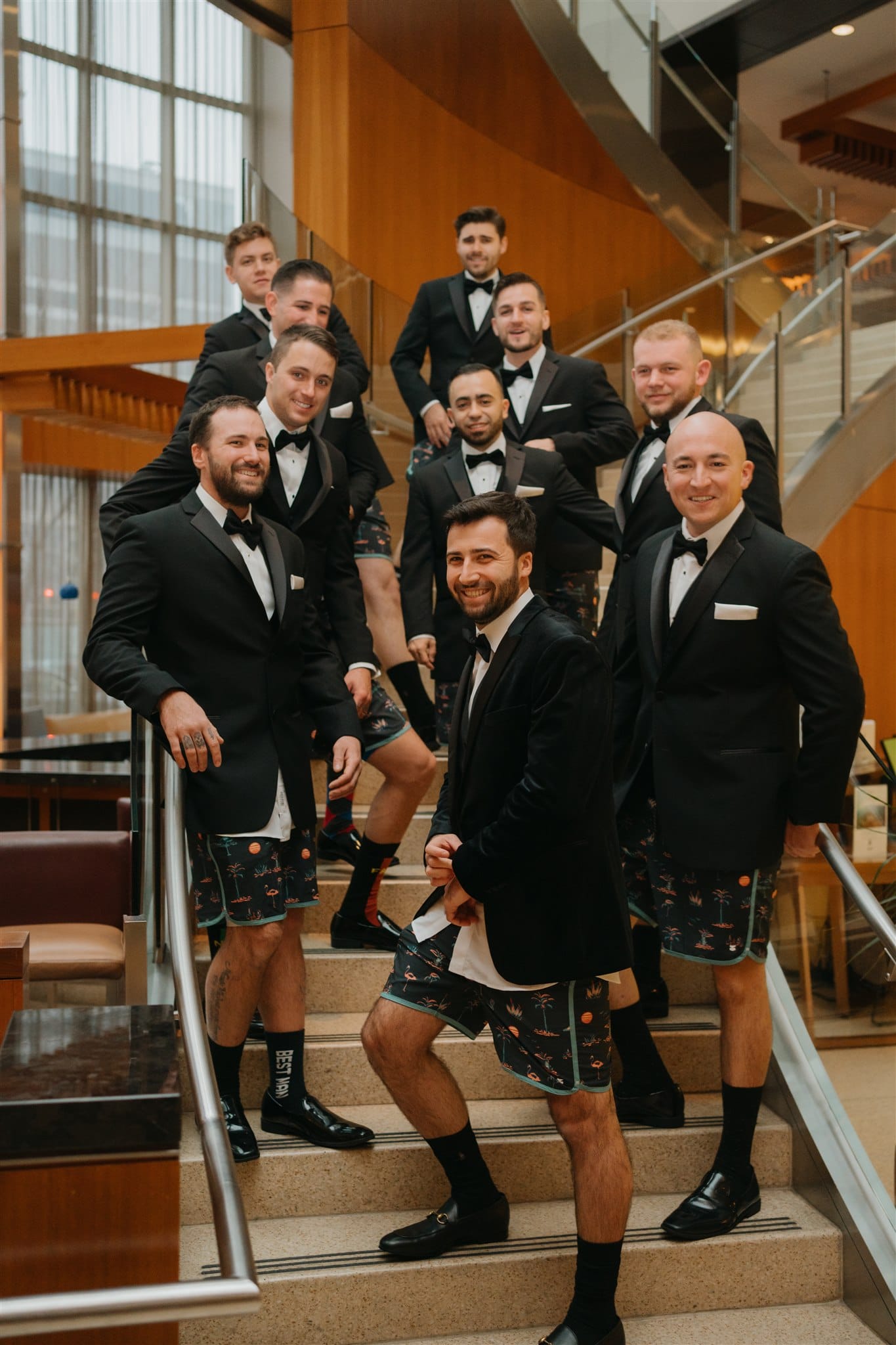 Jake wore a velvet black Jacket, and the groomsman wore black tuxes.
