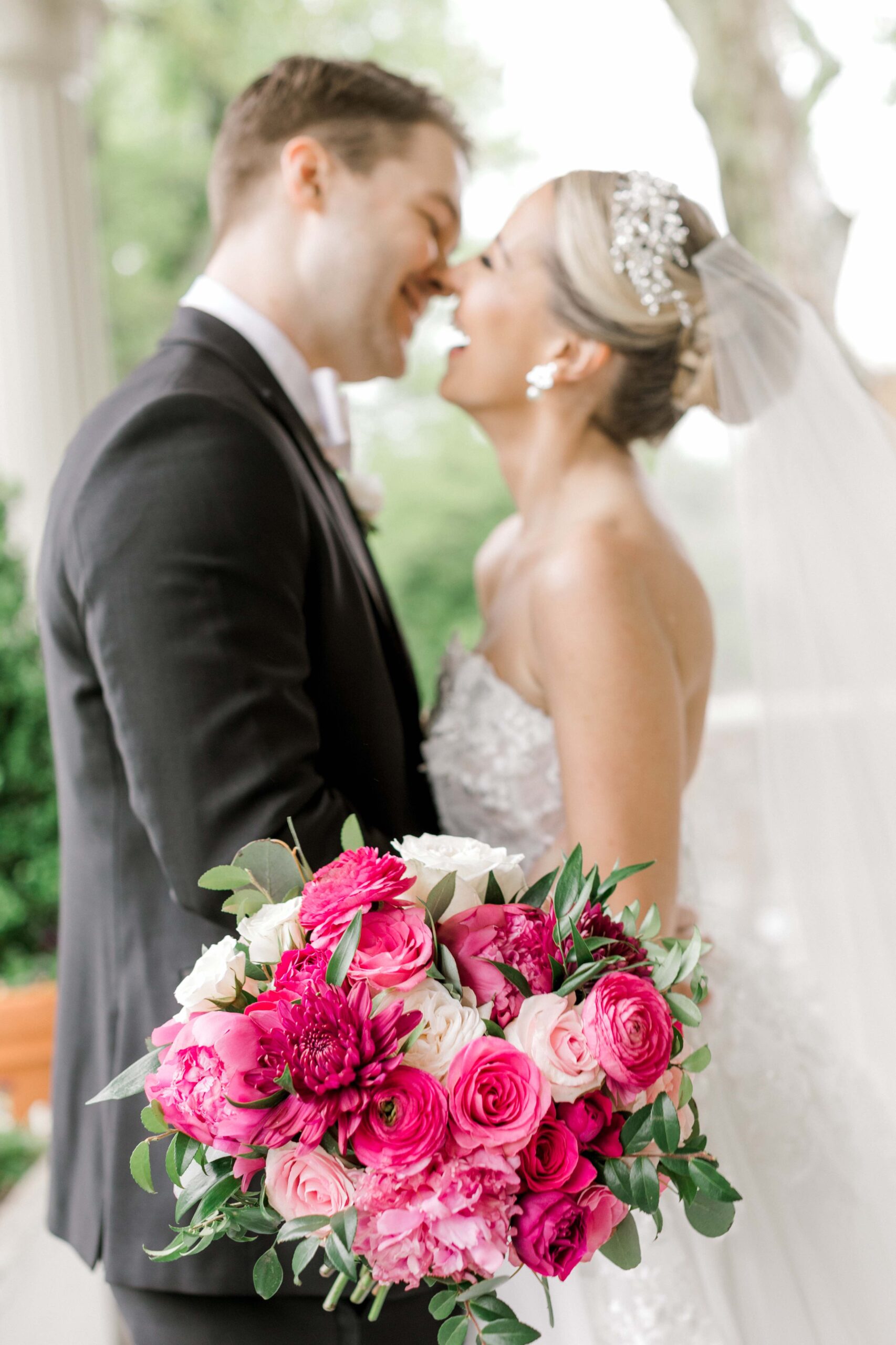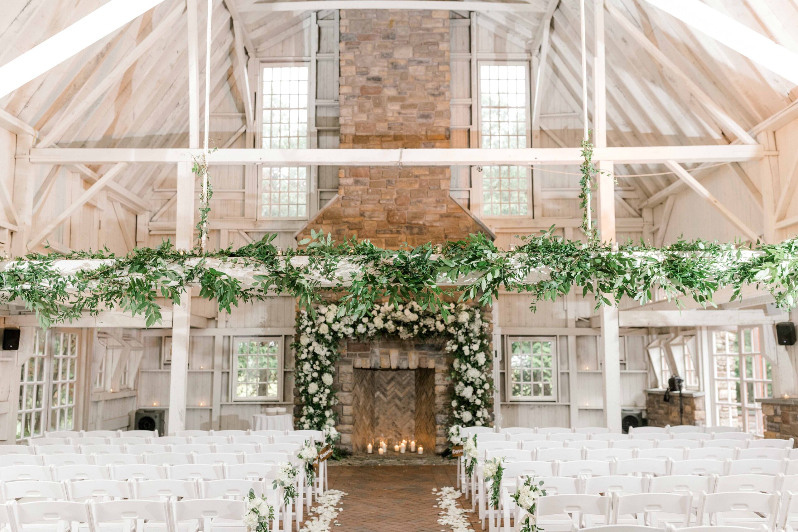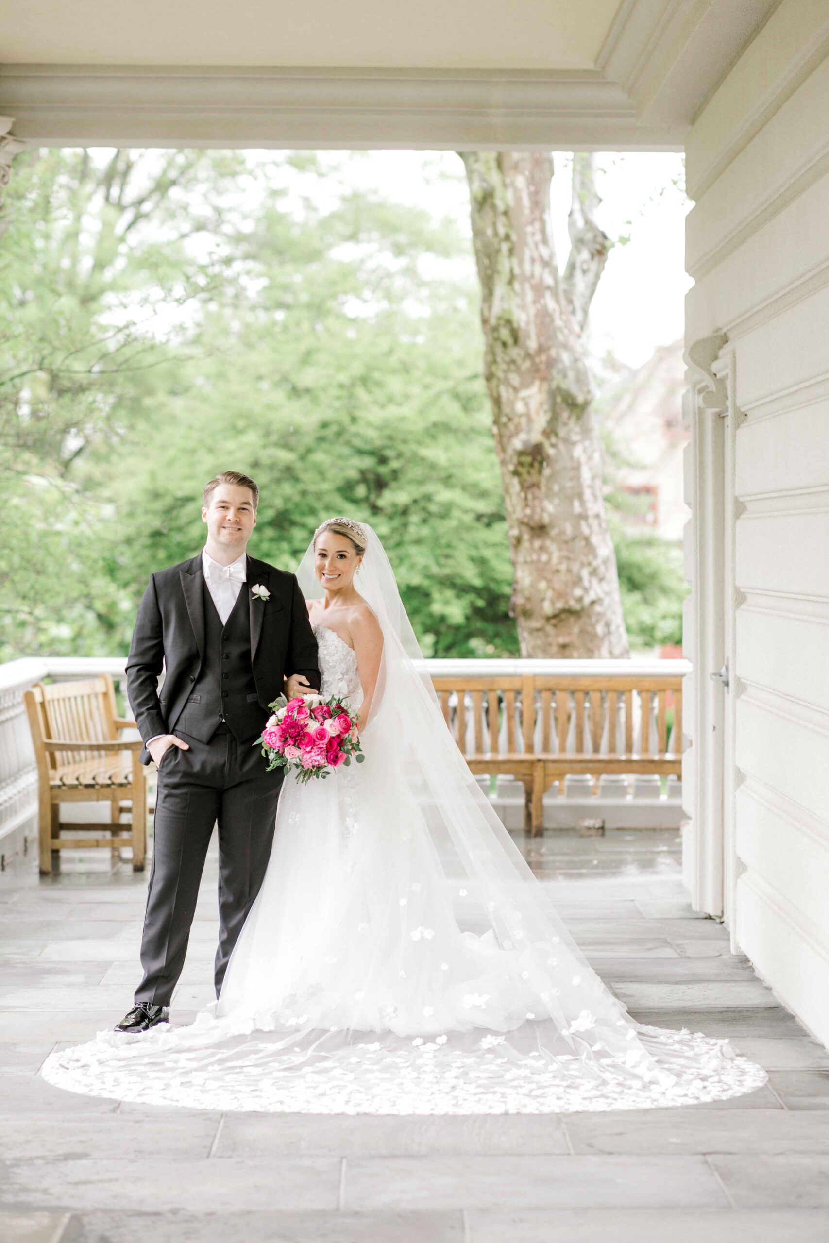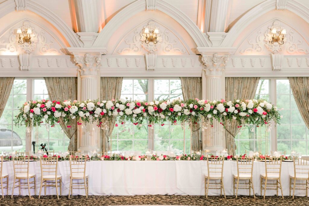“We had incredible florals throughout the entire day—most notably the ballroom was beautifully draped with shades of pink, burgundy, white and green,” says Kara. The ballroom for their April 28, 2023, wedding had an incredible long head table including flowers floating down from above and floating candles. For the guest tables, there were a combination of grand trees and candelabras with florals. “For the ceremony, we stayed with traditional whites and greens,” says Kara. “There was a beautiful arch, rose petals lining the aisle, two grand pedestals upon entry, as well as greenery on the beams of the barn. We had a handfasting ceremony using a custom-made rope with our wedding colors.”