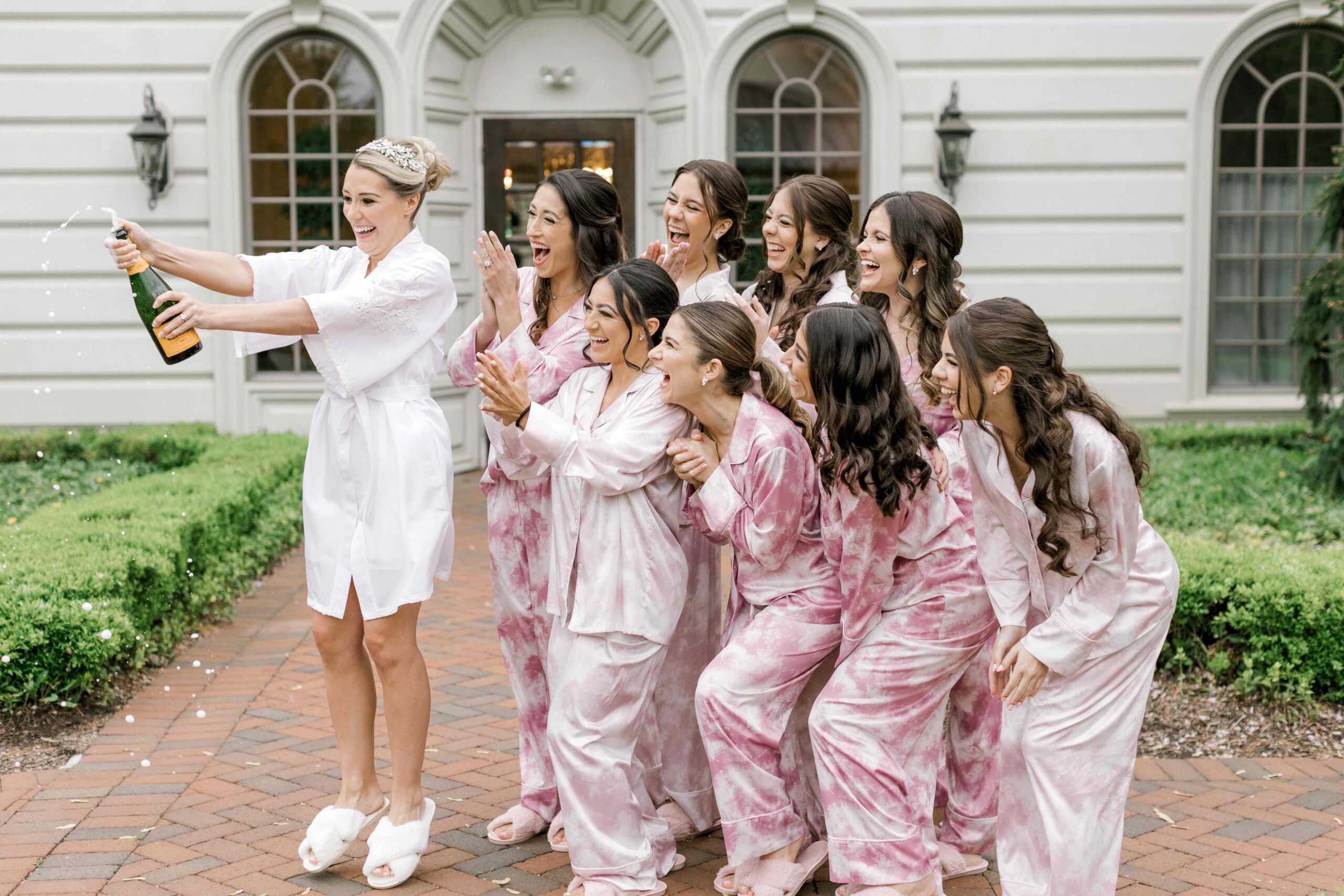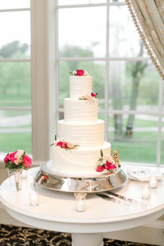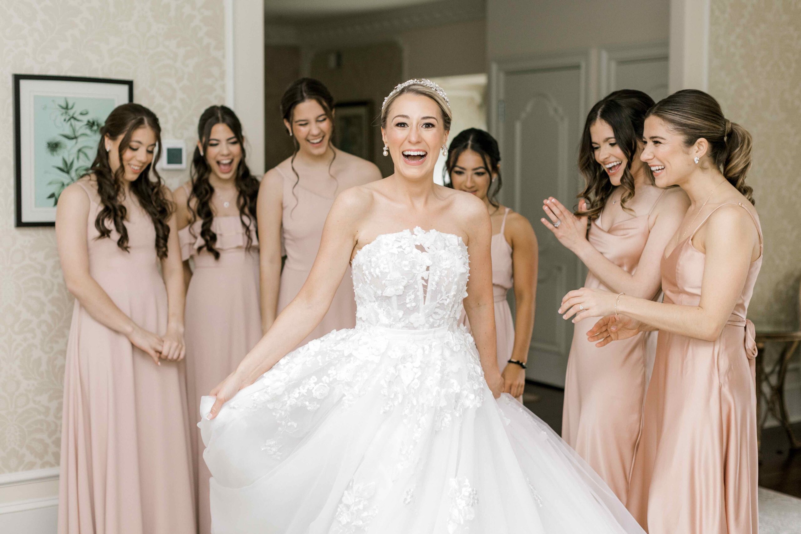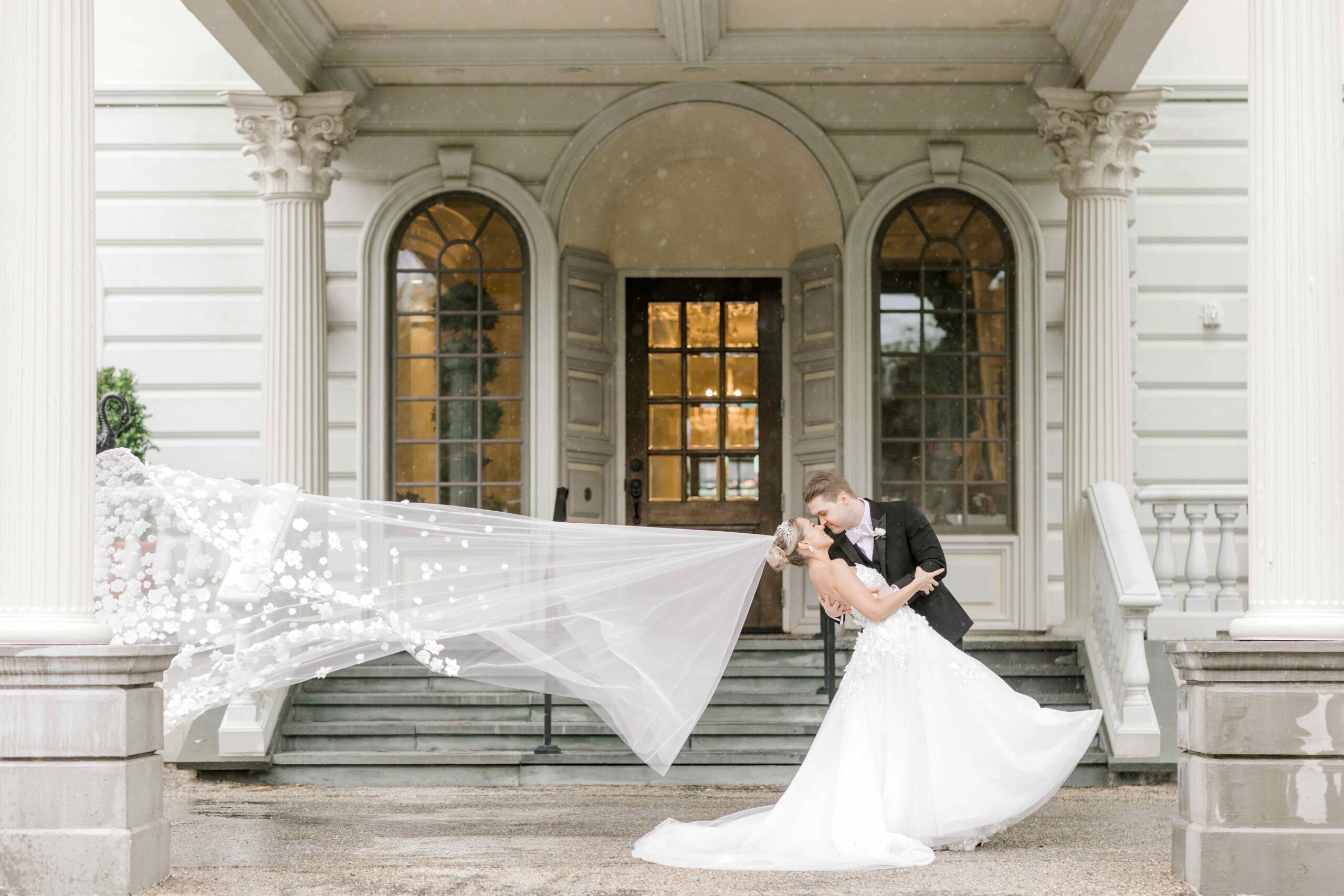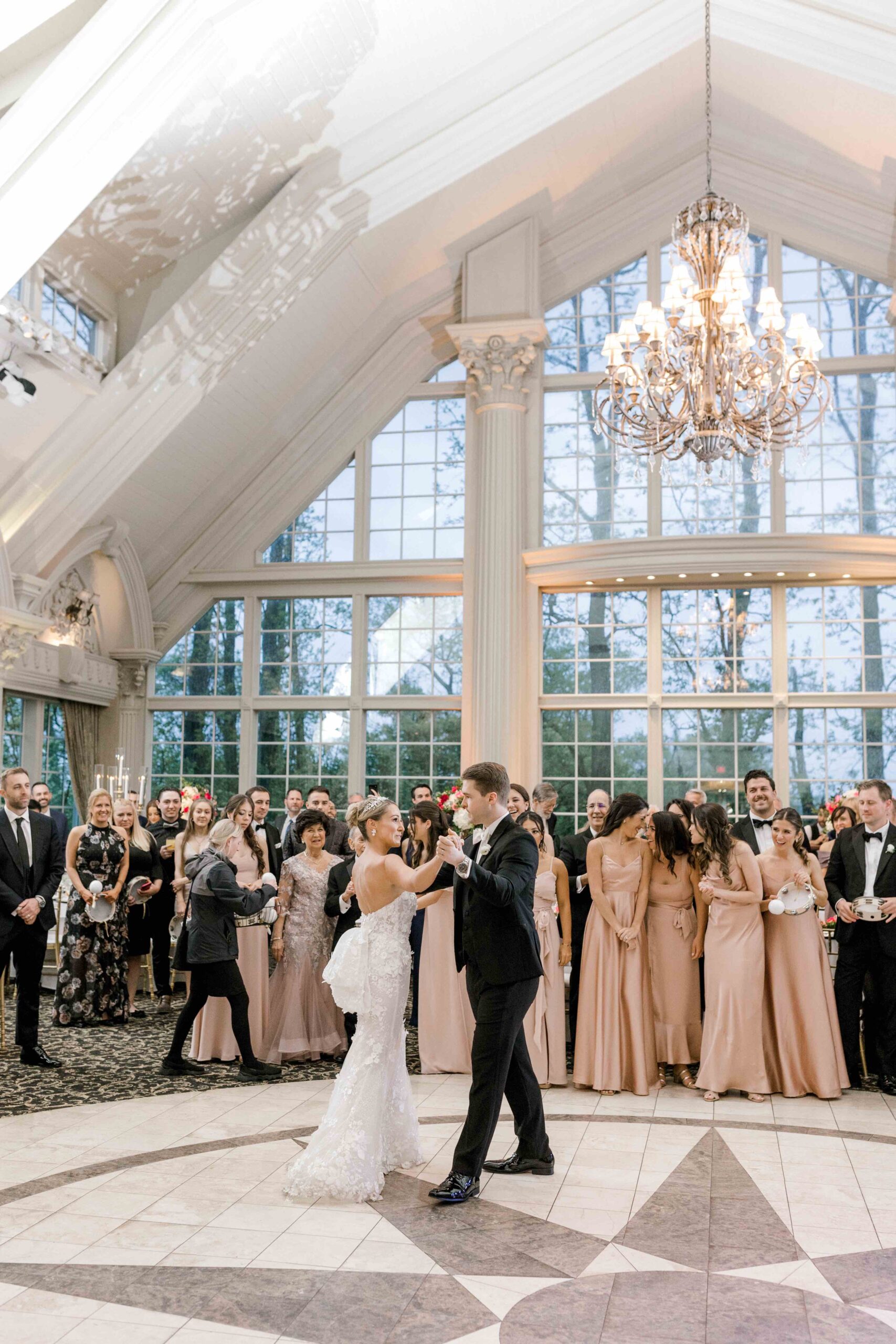 “We had incredible florals throughout the entire day—most notably the ballroom was beautifully draped with shades of pink, burgundy, white and green,” says Kara. The ballroom for their April 28, 2023, wedding had an incredible long head table including flowers floating down from above and floating candles. For the guest tables, there were a combination of grand trees and candelabras with florals. “For the ceremony, we stayed with traditional whites and greens,” says Kara. “There was a beautiful arch, rose petals lining the aisle, two grand pedestals upon entry, as well as greenery on the beams of the barn. We had a handfasting ceremony using a custom-made rope with our wedding colors.”