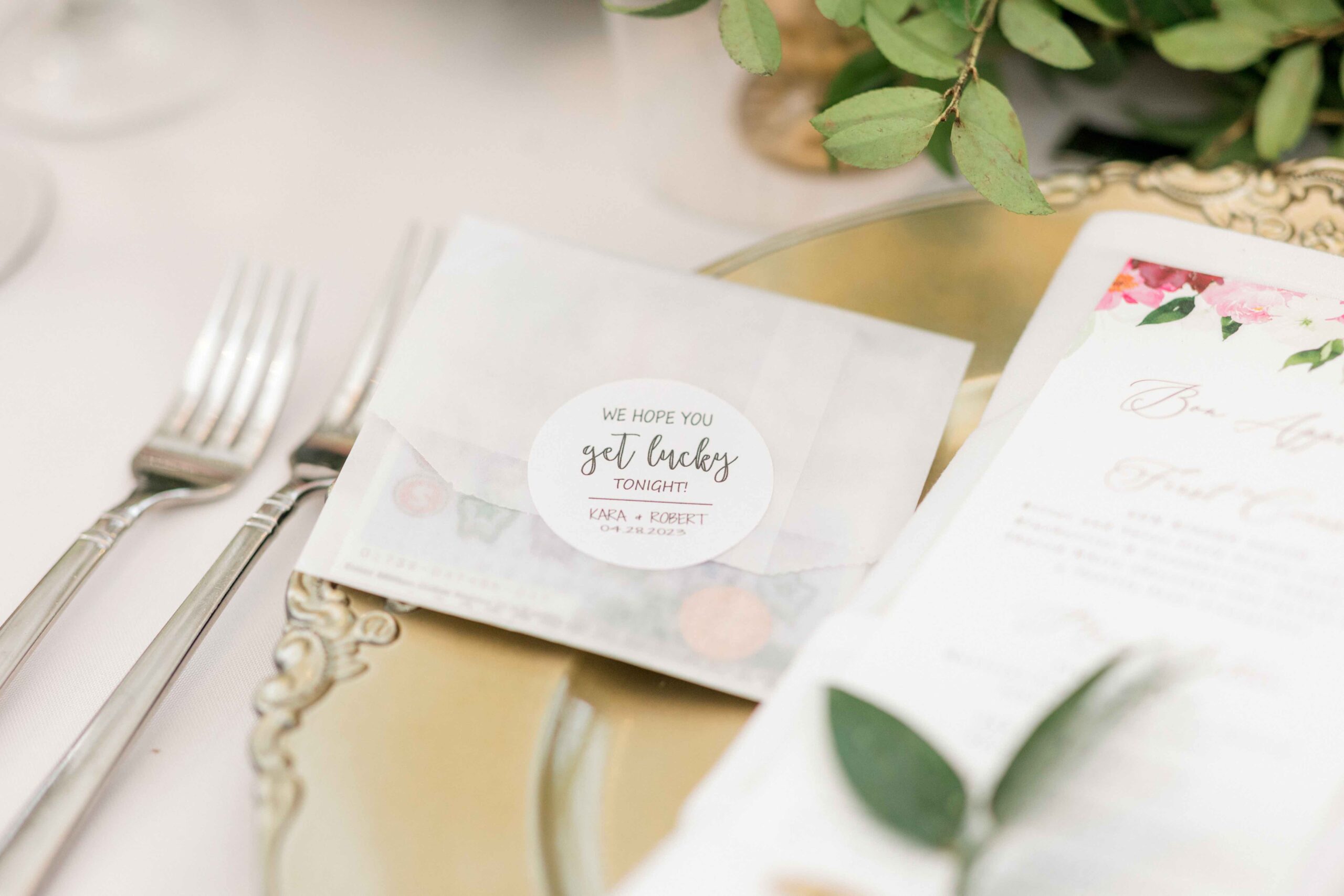 “Our favor was a lottery ticket with a sticker that read, ‘We hope you get lucky tonight!’ Fun fact: the favor at my parent’s wedding was also a lottery ticket. In our welcome bag was a custom ‘Wedding Day Post’ newspaper. Our cake had a Penn State Nittany Lion figurine as my husband went there and still very much loves Penn State. Our guest book was a tree sketch awaiting fingerprints from our guests. We had amazing music all night long. We had a three-piece string trio for the ceremony, a three-piece jazz trio for the cocktail hour, a 10-piece band for the reception, and a DJ for the after party.”