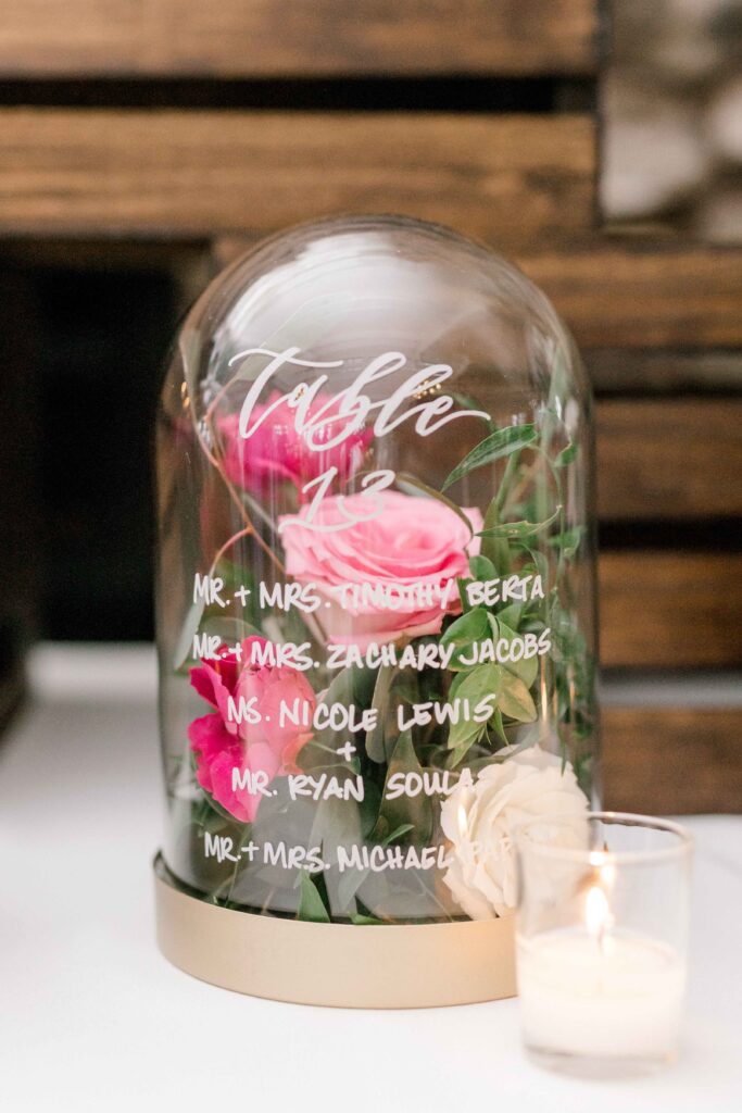 The seating chart for the wedding was 14 glass cloches filled with individual floral arrangements. Each cloche corresponded with a table at the wedding. They were placed along wooden crates, in front of a fireplace in the cocktail hour. A sign went along with this display noting “Be Our Guest!”