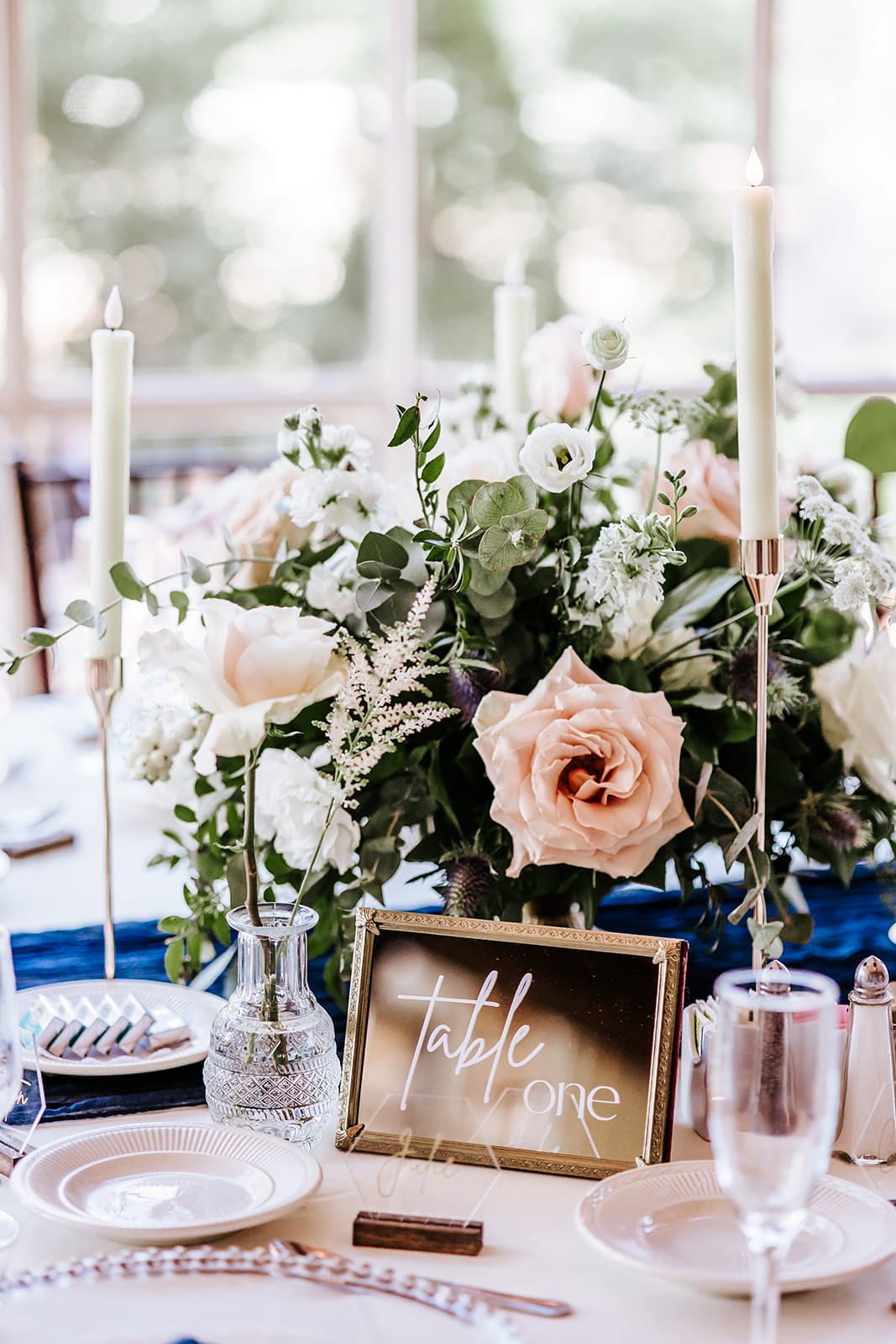 The florals were white spray roses with small touches of pale pink and blue. At the ceremony, the couple focused on the arch as the floral center point. There were small bud vases sprinkled around the cocktail hour space with floating candles in tall cylinder vases. At the reception, they used a mix of high centerpieces on gold stands and lower centerpieces in vases with bud vases around the table.