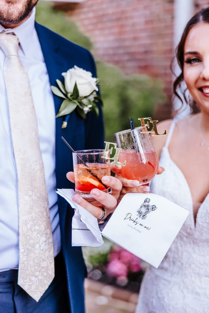 Their favors were customized shot glasses that also served as escort cards for guests to find their seats.