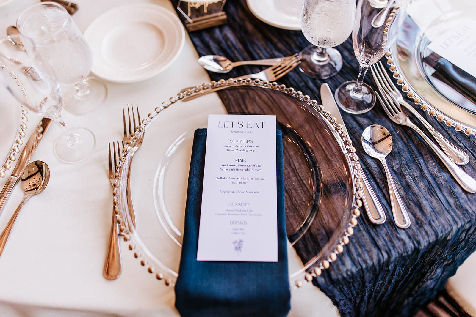 The couple chose a theme of “vintage elegance” with a color palette of navy blue, neutrals, gold and white. Bridesmaids wore satin navy, while groomsmen wore stone khakis with navy accessories.