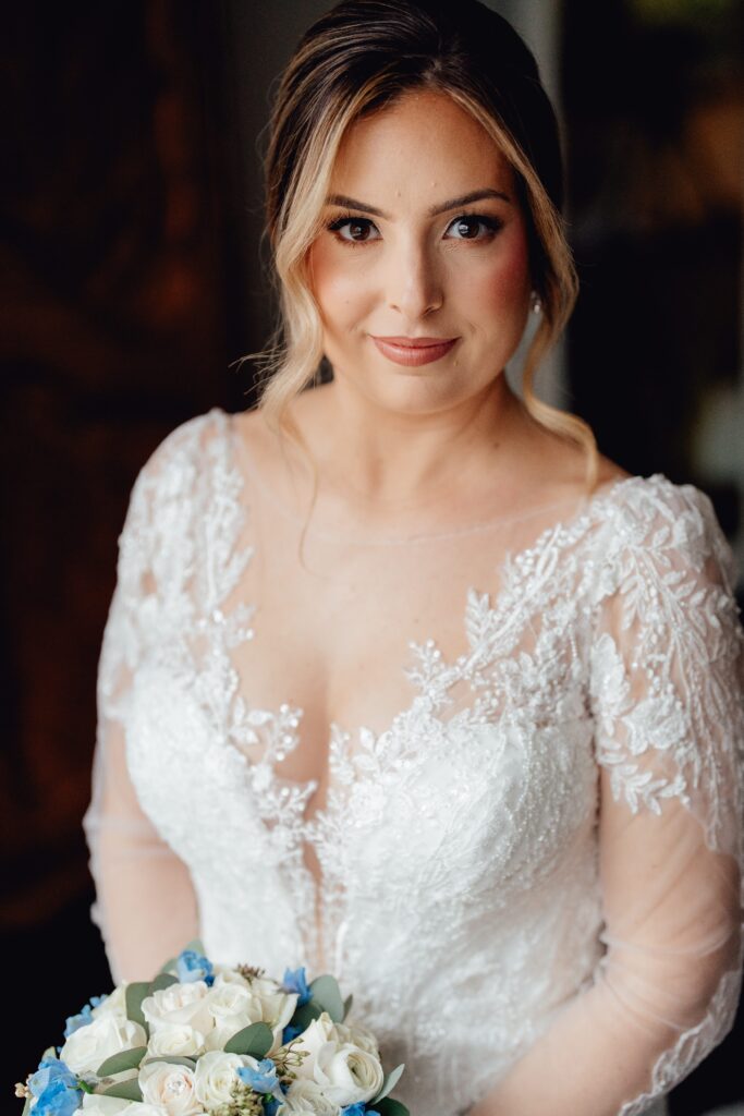 The couple chose a dusty blue theme with a pop of color for their big day. Their cake topper was figurines of the two of them in Cafe Bello uniforms.