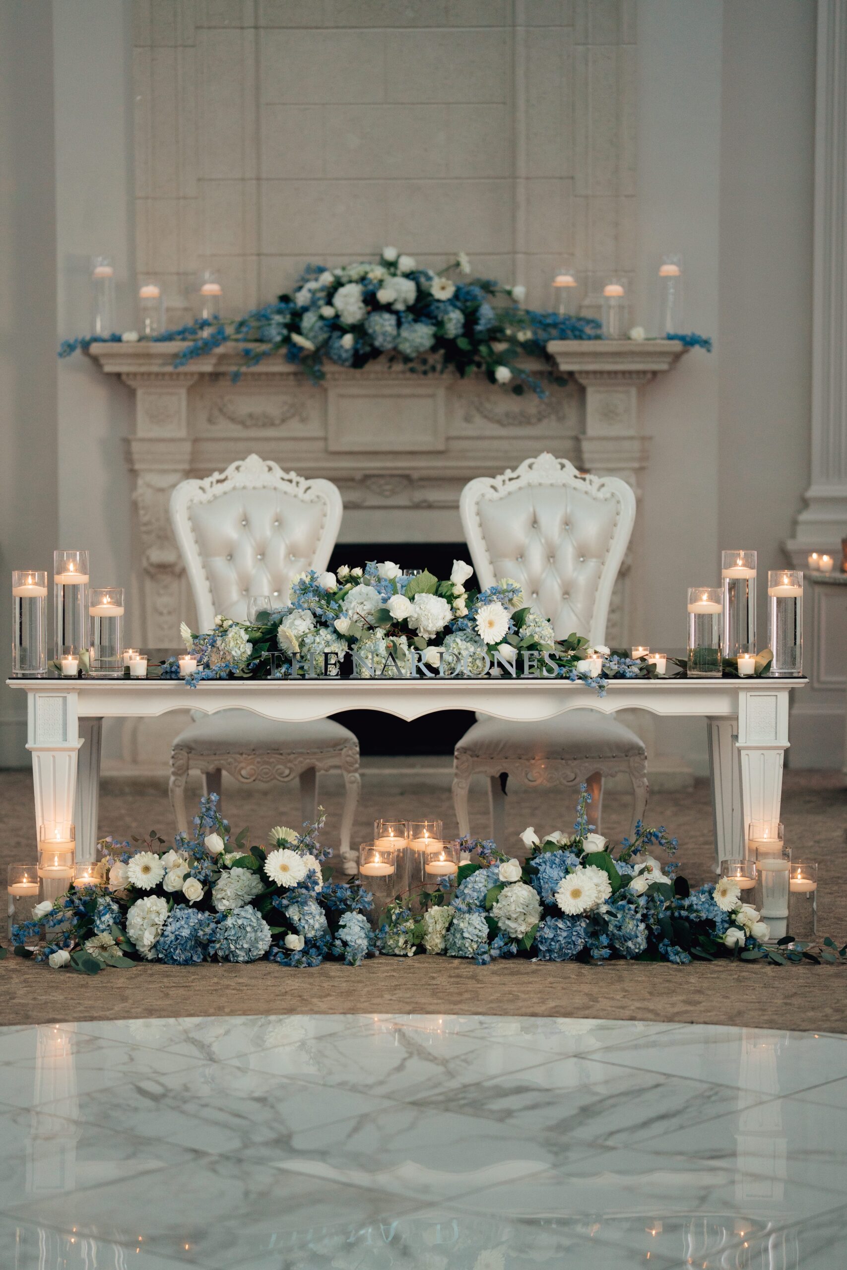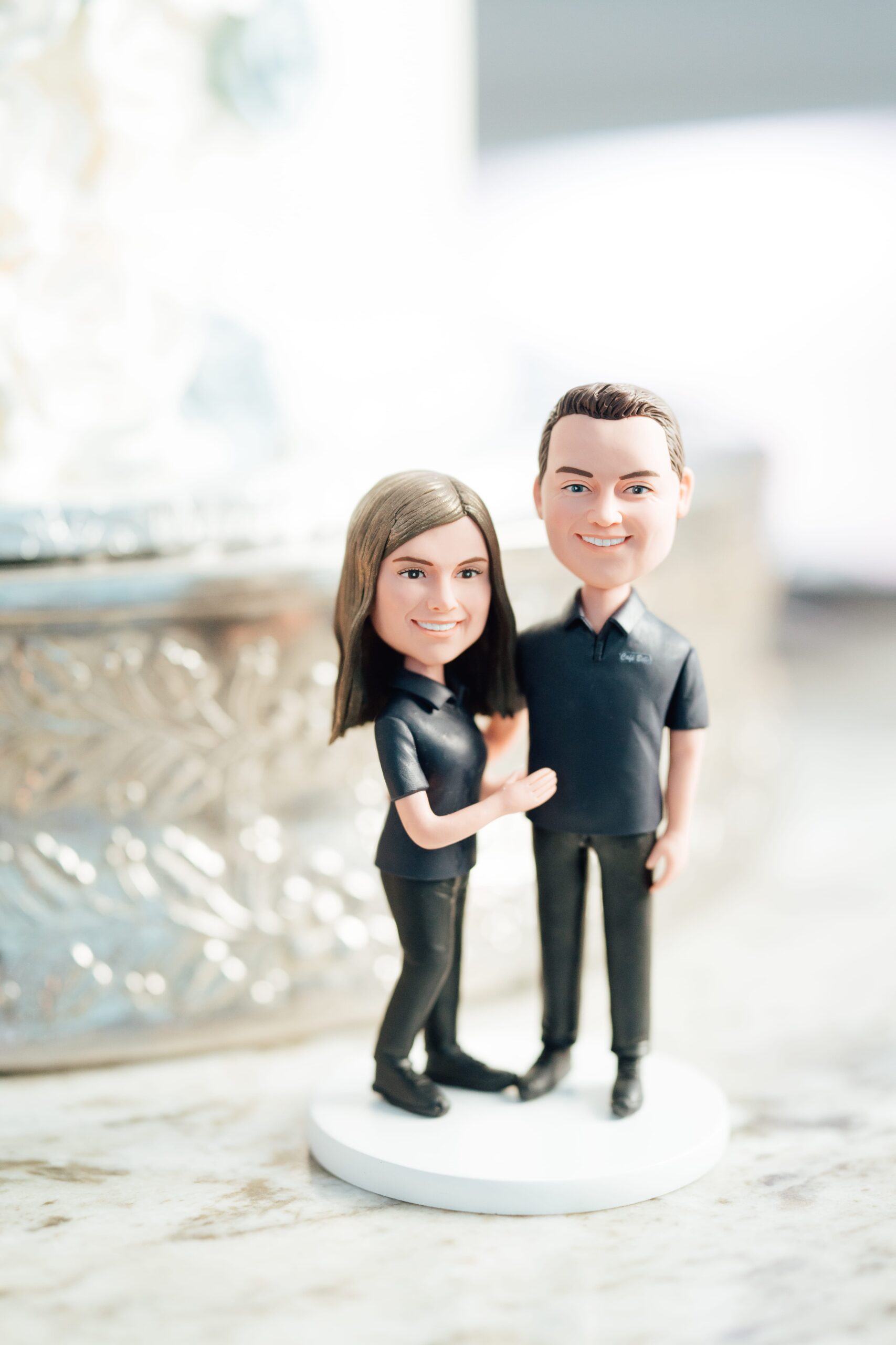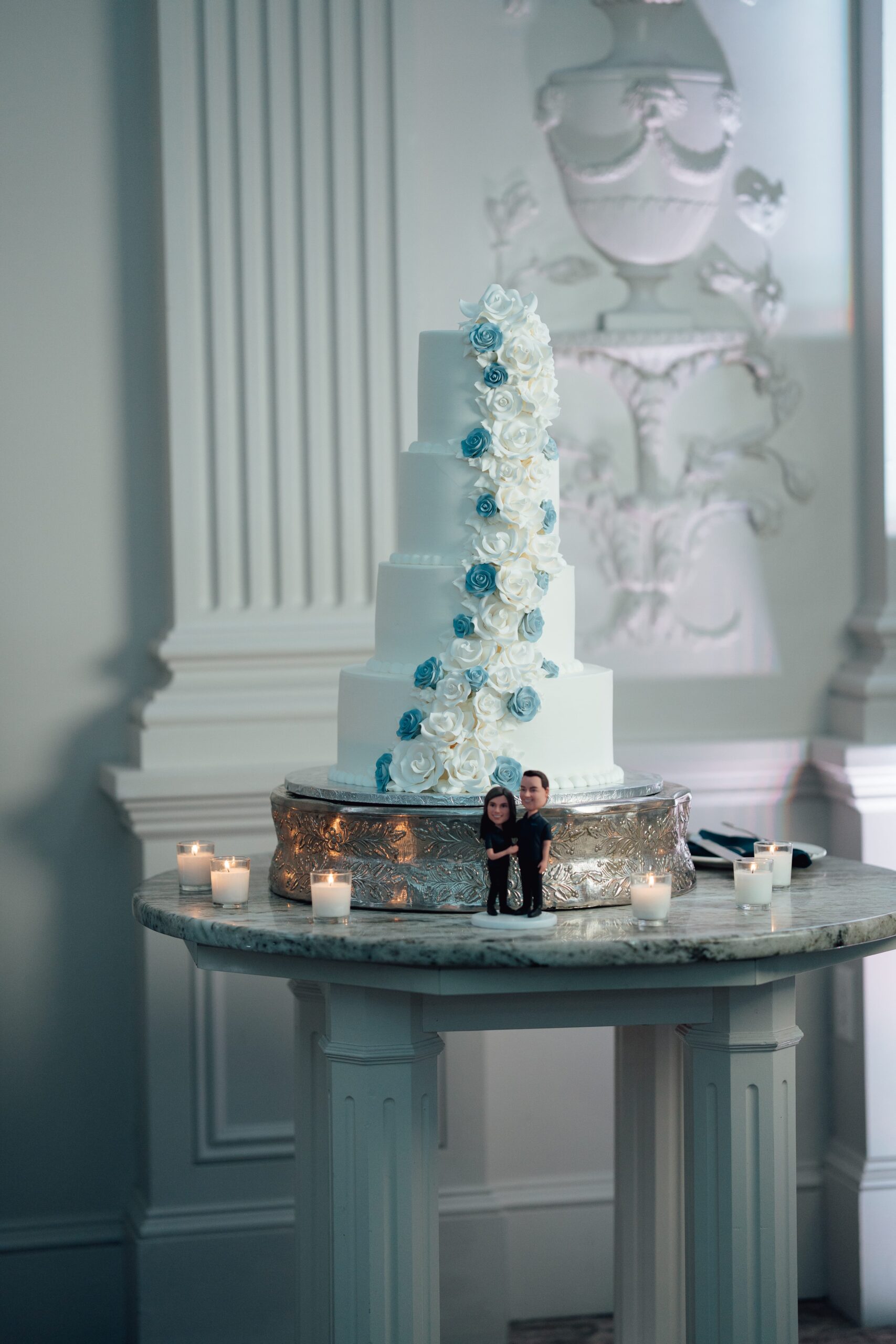 The couple chose a dusty blue theme with a pop of color for their big day. Their cake topper was figurines of the two of them in Cafe Bello uniforms.