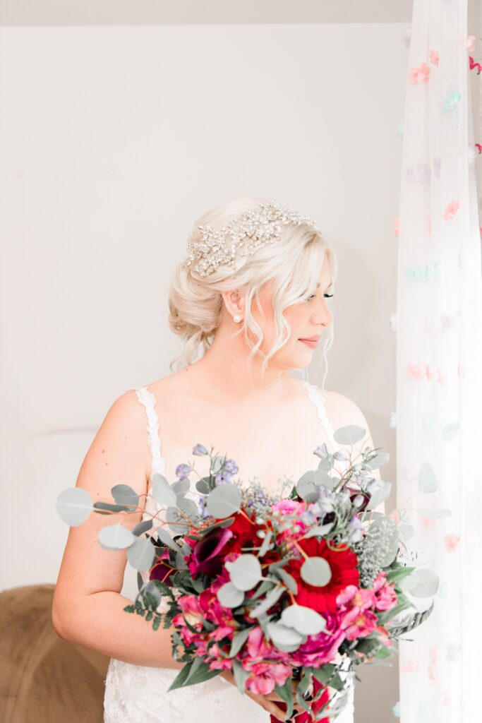 “I was not a huge fan of a lot of florals but rather candlelight—with him as a fireman, I think it killed him a little on the inside,” says Kourtney. For the bouquets, “I knew I wanted to steer clear of baby breath and pastel and white flowers. I opted for a lot of eucalyptus and deep colored florals.” They were wrapped with hot-pink tulle fabric.