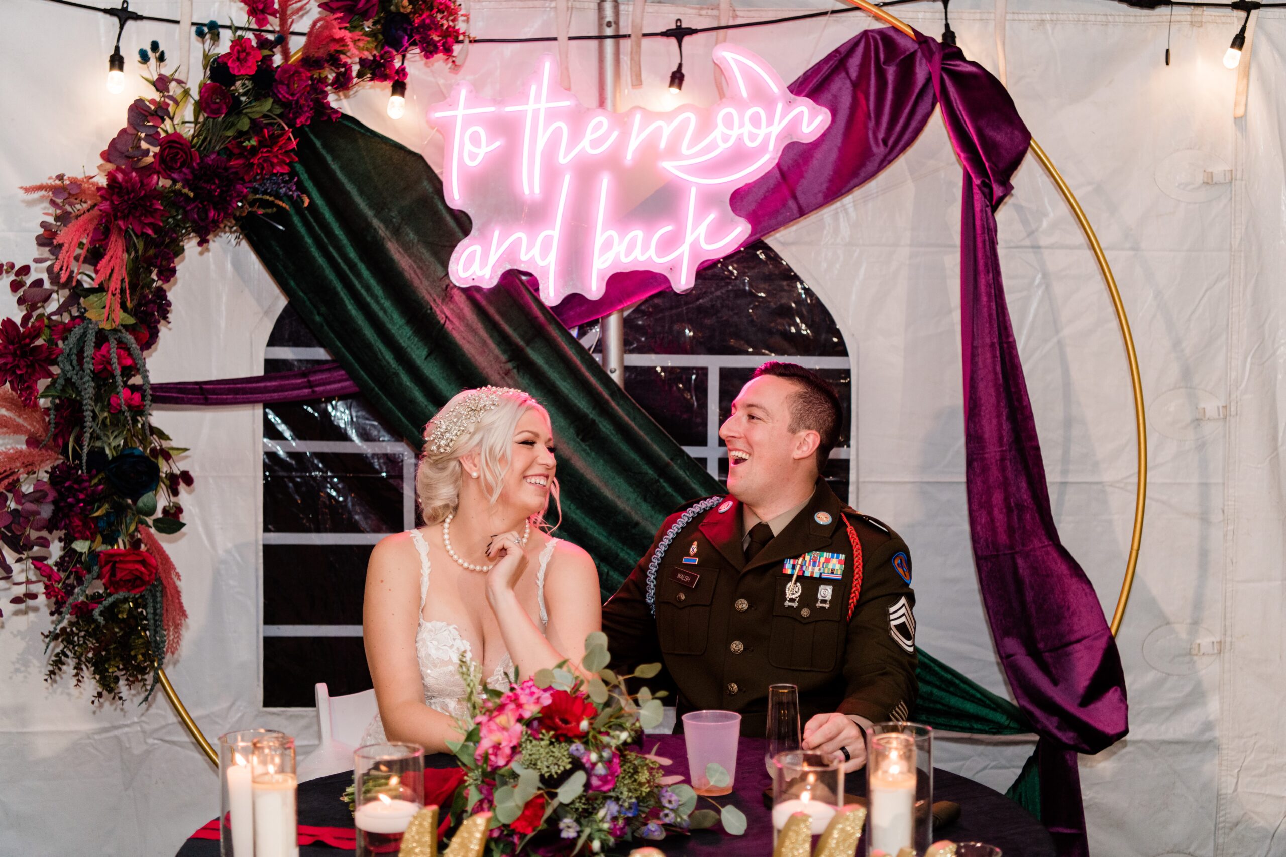 The bride’s sister created a beautiful arch from faux flowers that sat behind the sweetheart table from faux flowers, which made the neon sign pop.