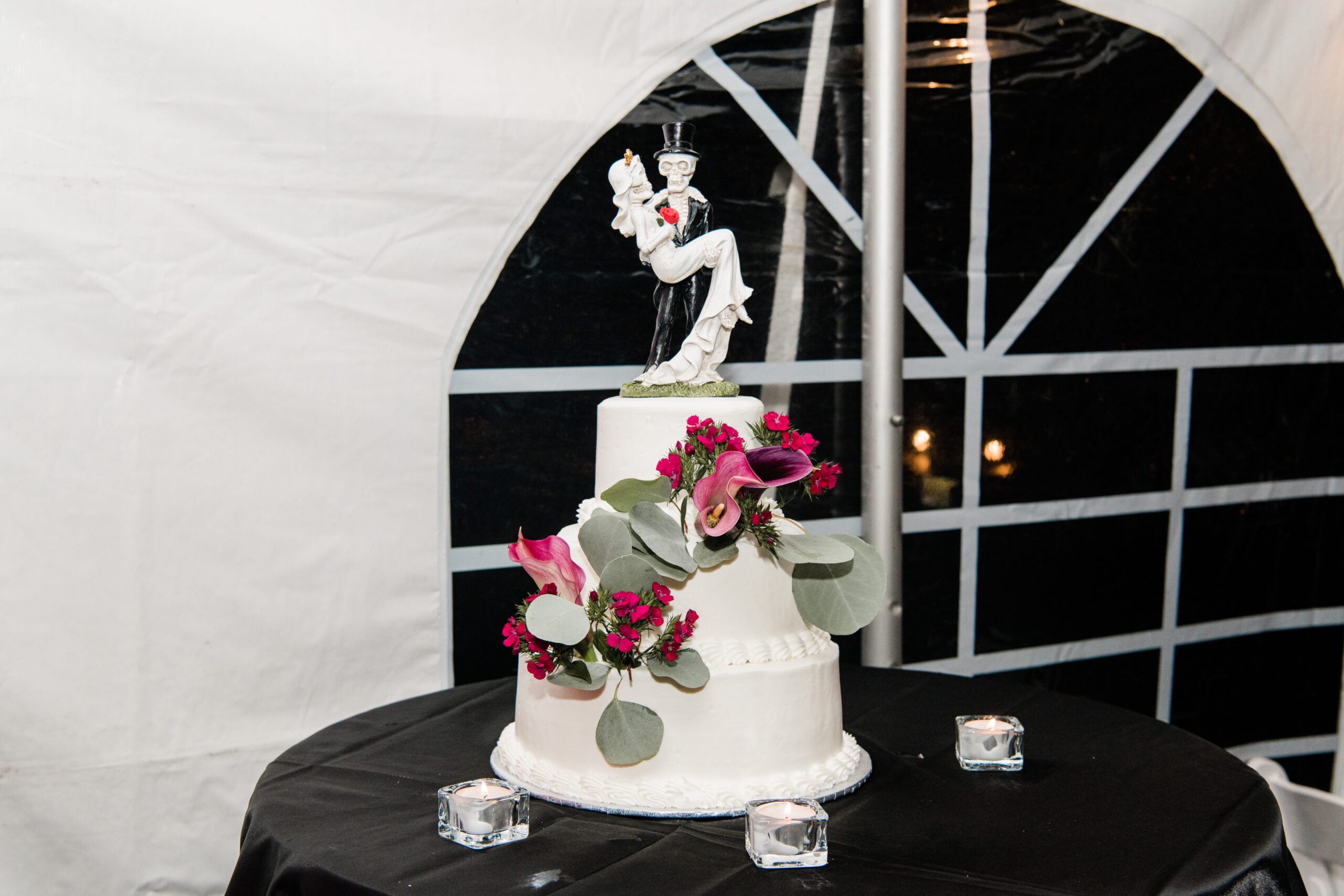 Both Kourtney and Dylan are into “deep, moody colors,” which was evident throughout their wedding. Main colors were emerald green and deep fuchsia. Tables were black with either a velvet emerald or velvet fuchsia runner with candles; many accents were black to have those two colors pop.