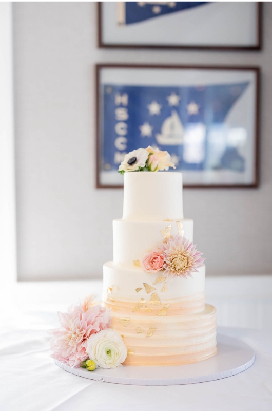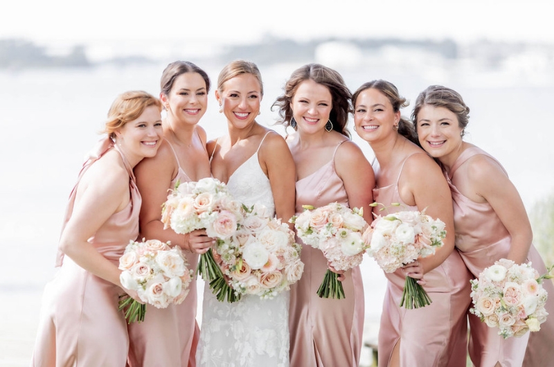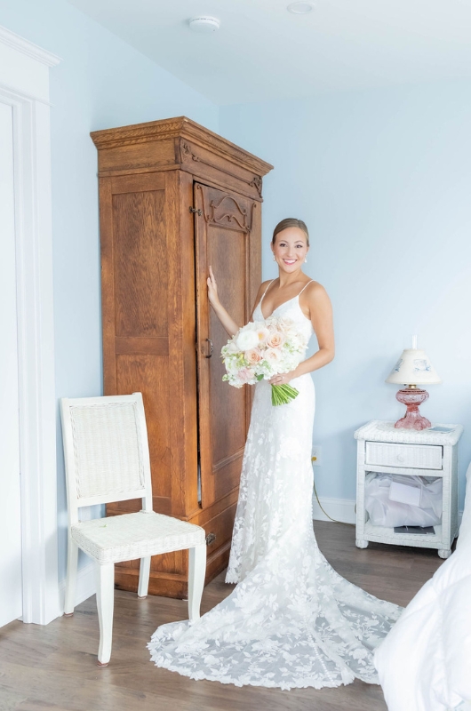 “Our wedding was simple and so beautiful,” says Laura. “We had an entire weekend of events, the rehearsal lunch at La Dona in Cape May, then we all went to the beach. Welcome drinks were on the porch of the Inn of Cape May, where a live band was playing and the ocean breeze was terrific. Our cake was three tiers with a peach watercolor looking base layer and flowers cascading down the side, it was butter cake with lemon curd filing. I highly recommend the bakery! The colors during the wedding were primarily neutral with soft pinks and peaches. The bridesmaids wore satin rose gold dresses and the groomsmen wore black tuxes. The flowers for the bouquets, at the ceremony, and in the reception were soft, fluffy and romantic.