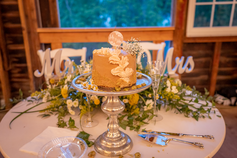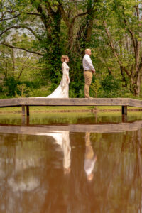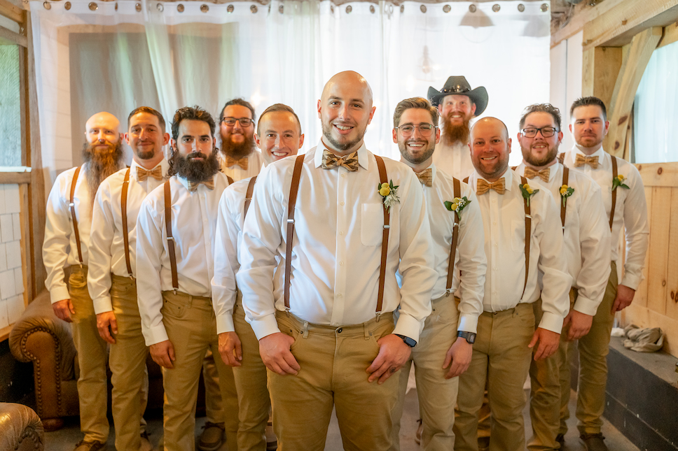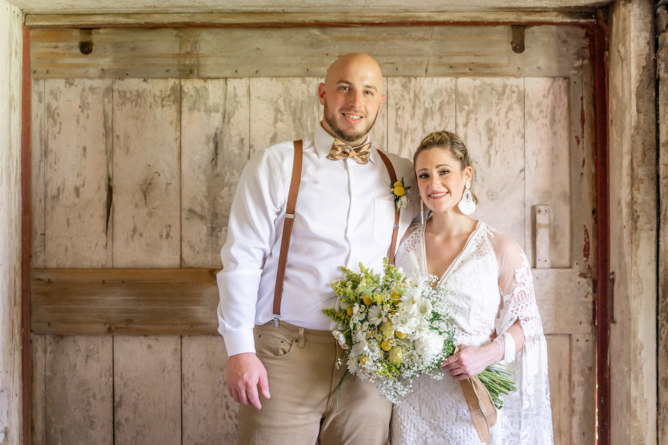 As animal lovers, Leah and Zeppy were enthusiastic about touring Glenmoore Farm in Hopewell Township, which is home to an active animal rescue. “It was Prudence, the paralyzed pig, that melted my heart,” says Leah. “After meeting her, I instantly turned to Anne, the farm owner, and yelled ‘take my money!’” The pair brought a hint of their personal style to the day via their centerpieces—beer growlers collected from their favorite breweries—and accentuated the venue’s rustic charm with yellow florals, antique tableware and natural wood. For their first dance, the couple chose “You’re Still the One” by The Maine.