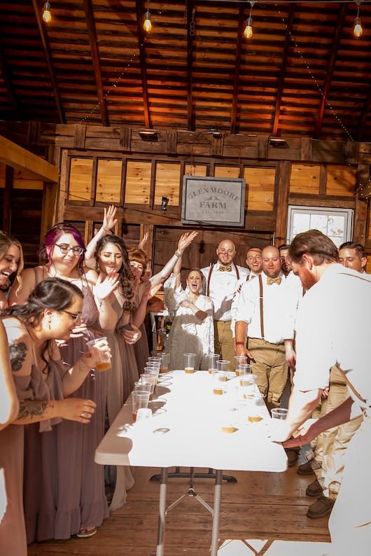 With the couple’s shared interest in mind (she’s a brewery manager, he’s a mechanic and a craft brew lover), Zeppy worked with friends to create a one-of-a-kind proposal during a summer barbeque. Hop Hedz Gear of Harrisburg, Pennsylvania, created custom labels for a case of beer made by Stickman Brews. Alongside the bespoke art was a simple message: “Will You Marry Me?” After seeing the cans, Leah found Zeppy waiting patiently beside her, down on one knee.