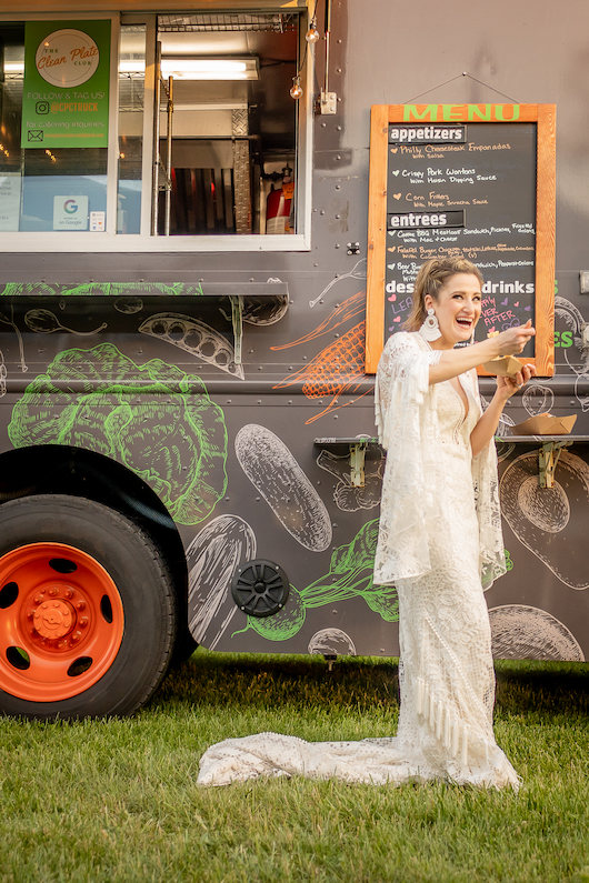 Throughout the evening, guests dined from an assortment of food trucks, sampling coal-fired pizza, artisanal burgers, corn fritters, and macaroni and cheese. And of course, there was no shortage of the couple’s all-time favorite thing: beer. A variety of local craft brews was flowing from The Wandering Brew, a mobile bar with vintage appeal. “We knew the alcohol portion of our wedding was going to be one of the most important details,” Leah says. Utilizing locally sourced materials and small businesses was also a must for Leah and Zeppy. An elaborate dessert bar, with to-go bags for guests, replaced traditional favors. Kettle corn, chocolate-covered pretzels, cupcakes and cookies—plus a donut wall—were a hit.