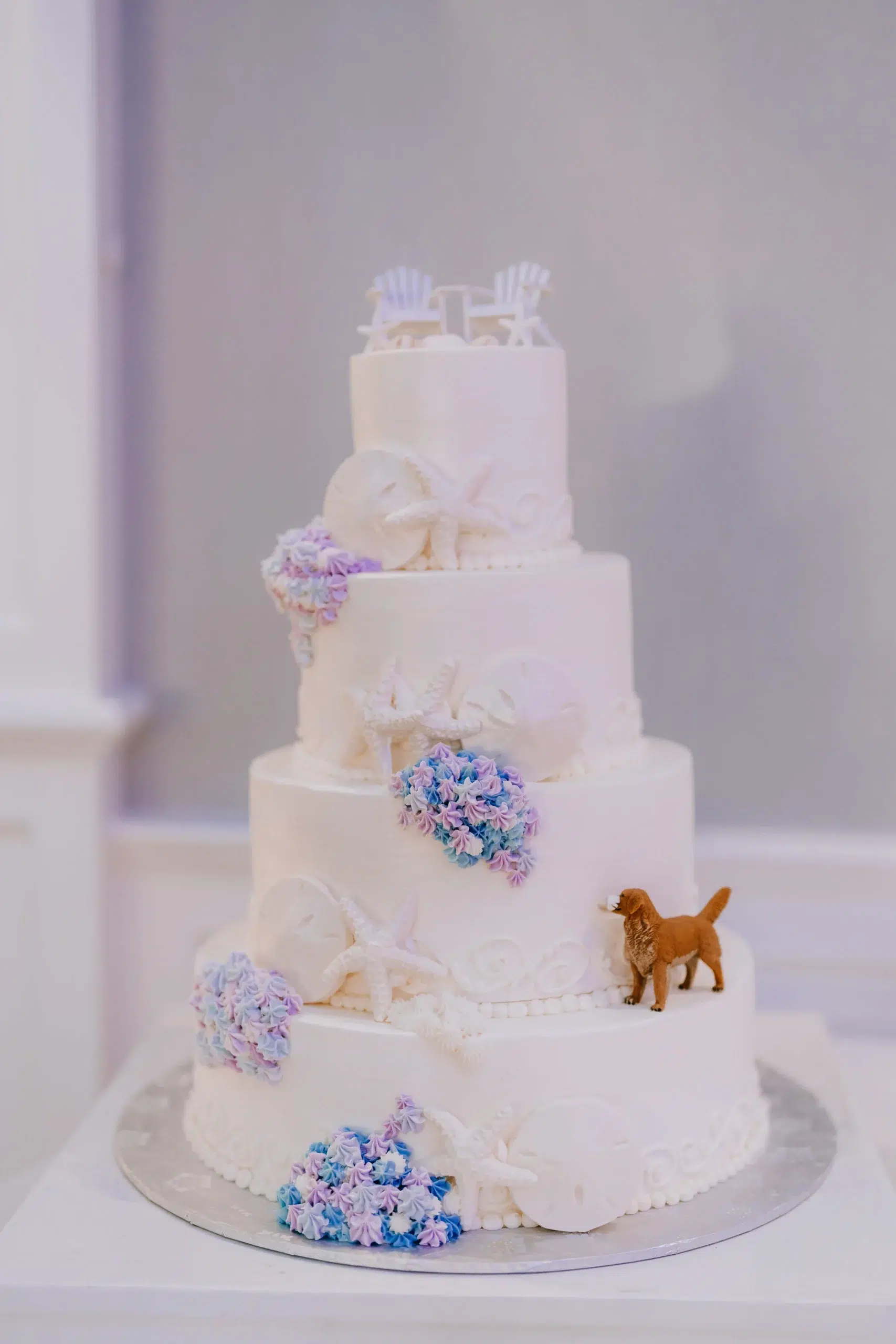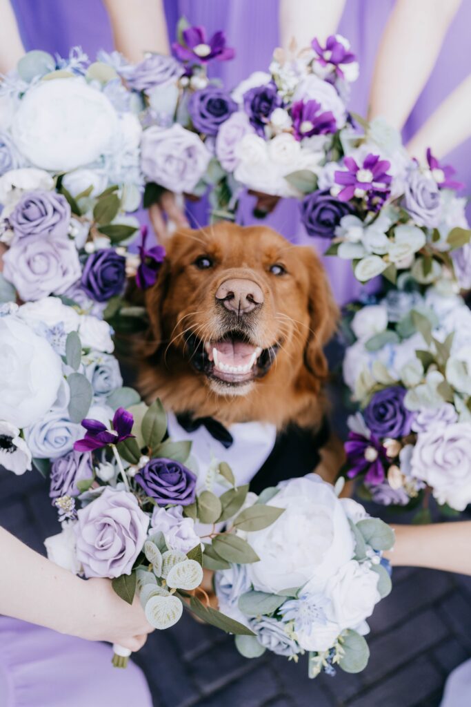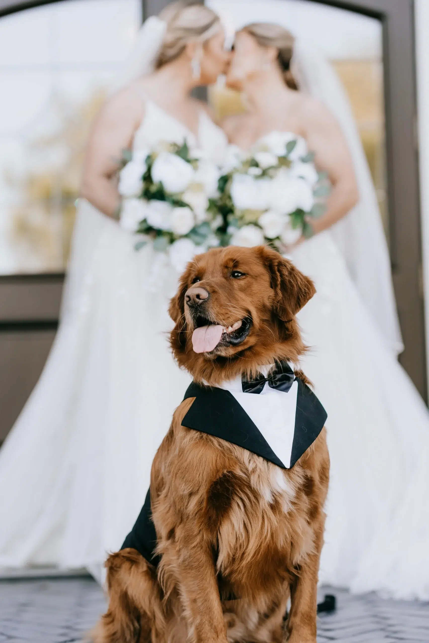 Their beloved golden retriever, Kody, dressed in his doggy tuxedo, posed with the brides at their first look. He was well represented during the wedding, too—the signature cocktails included the Kody Boy, a little dog figurine sat on their cake, and the couple danced with a large cardboard cutout of Kody.