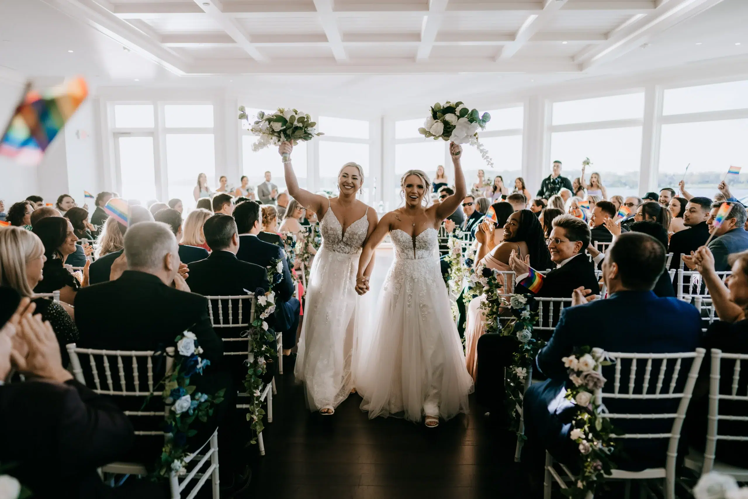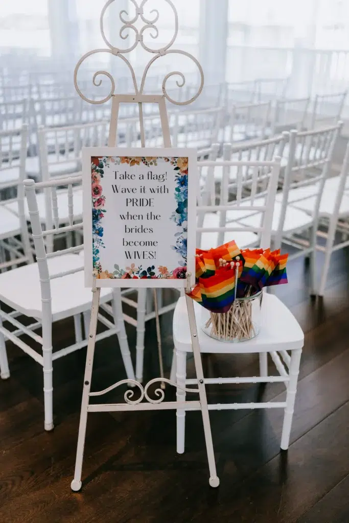 Their guests waved pride flags as the song “For Life” by Kygo played. “It was awesome to see our family and friends smiling and clapping for our love,” Lindsay says.