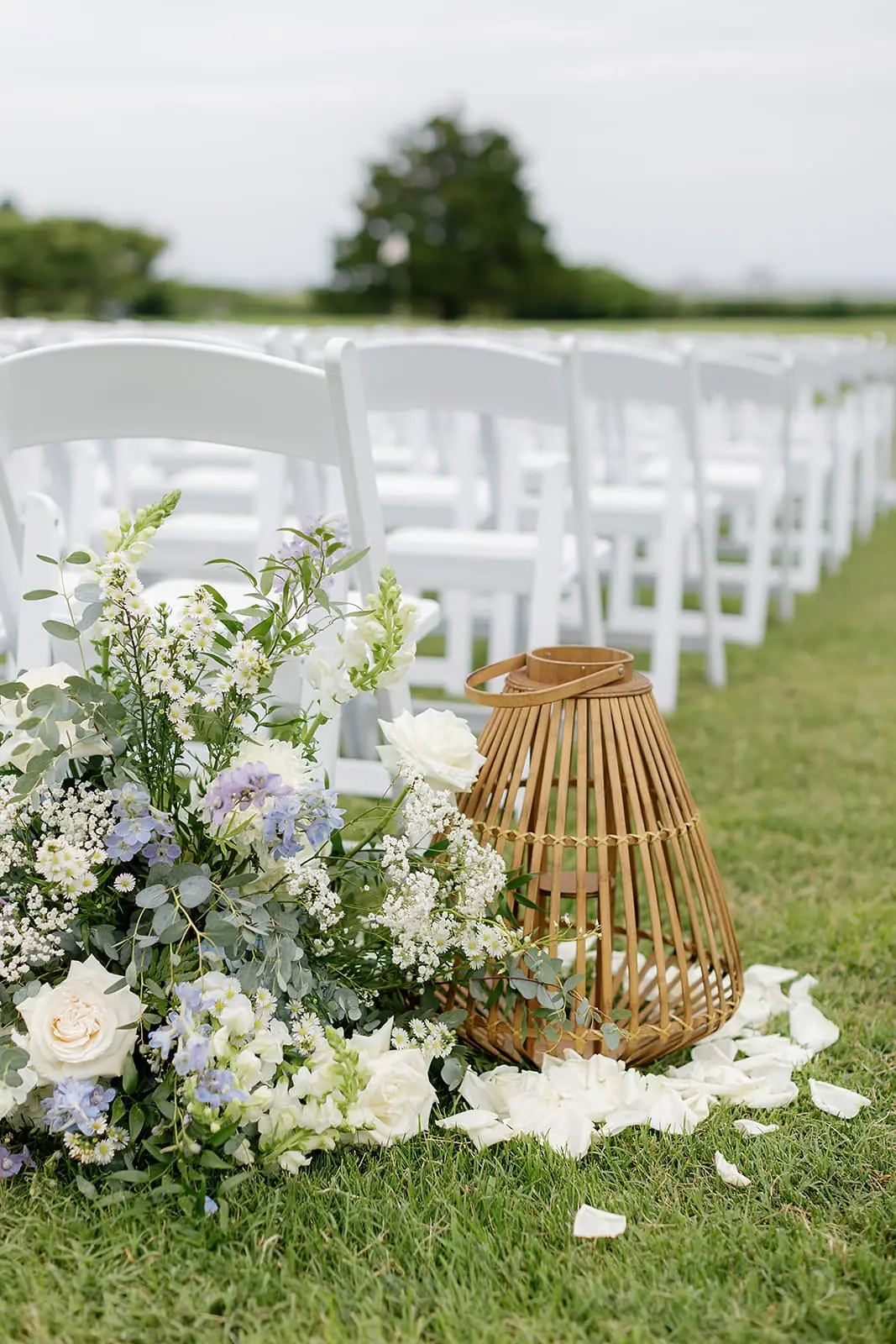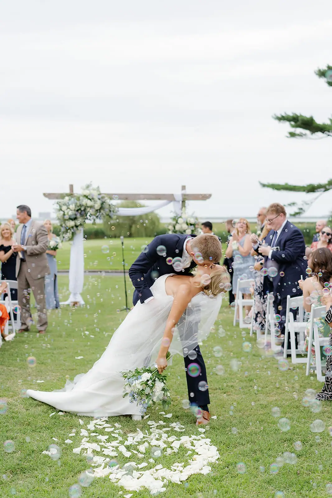 “We had a beautiful garden party wedding,” says Lindsey. “Our ceremony overlooked the bay on a cloudy day in July. Cocktail hour was outside and the ballroom was open and airy with big windows.”