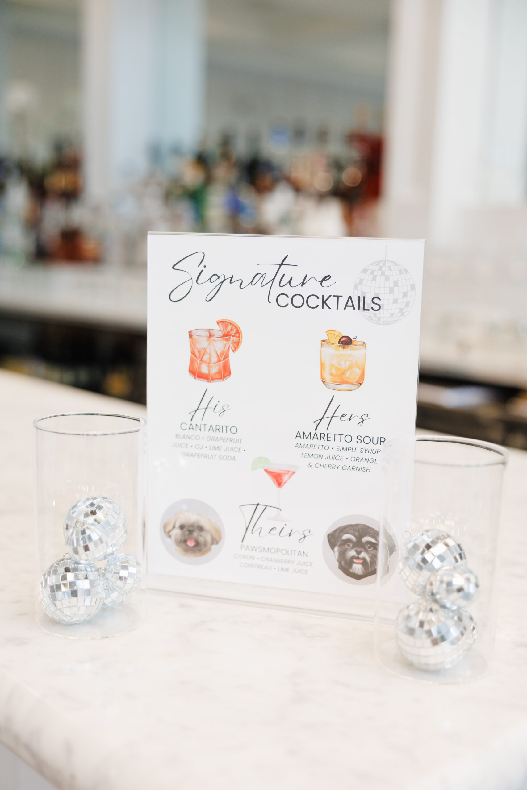 She tied in lots of disco ball elements. White and green flowers covered the old bank vault and dressed the tables and aisle, too.