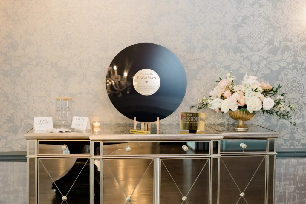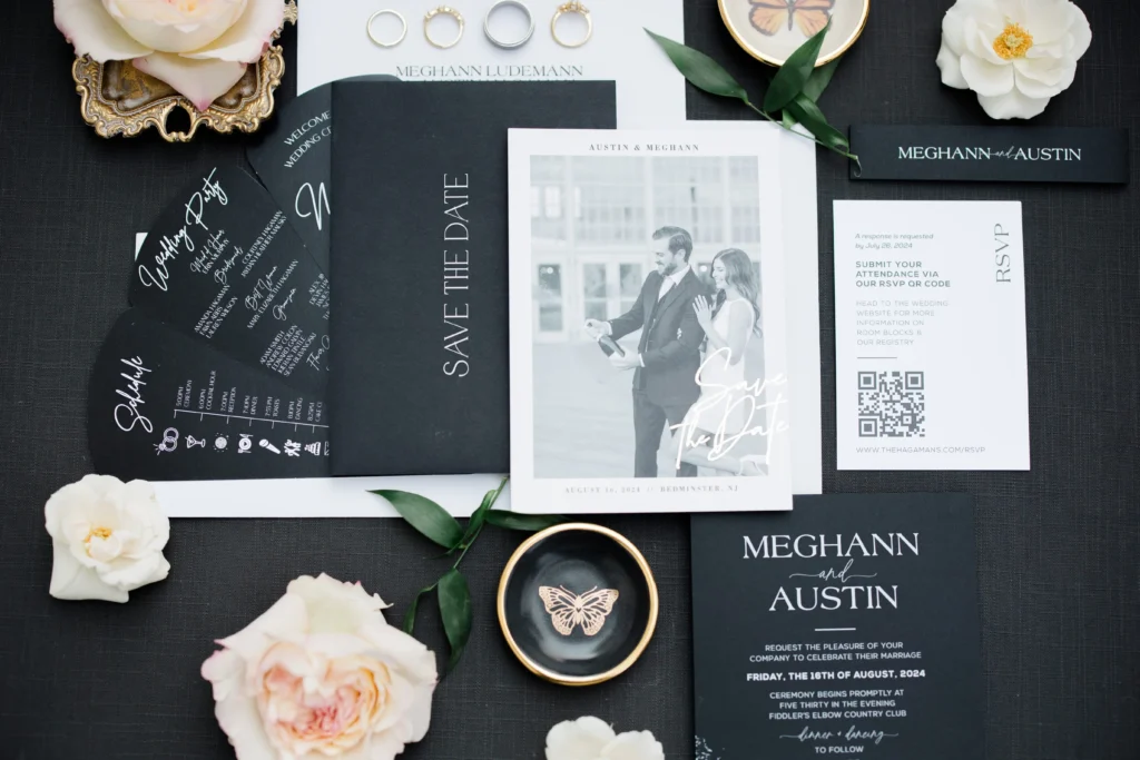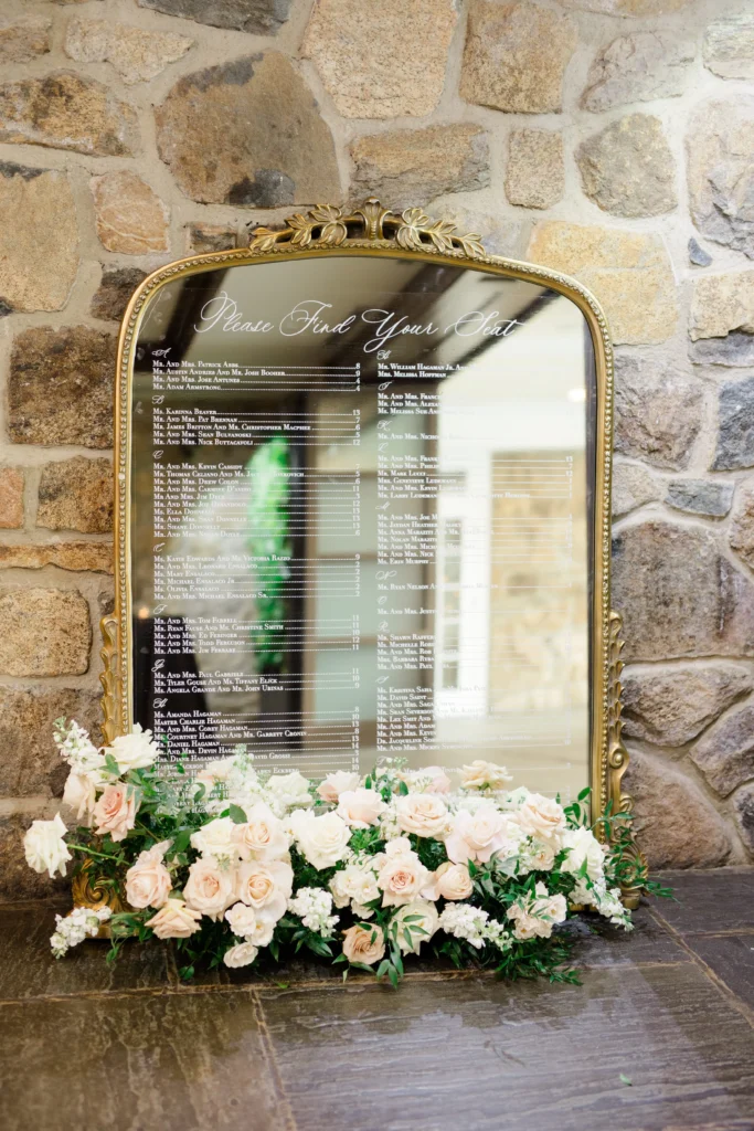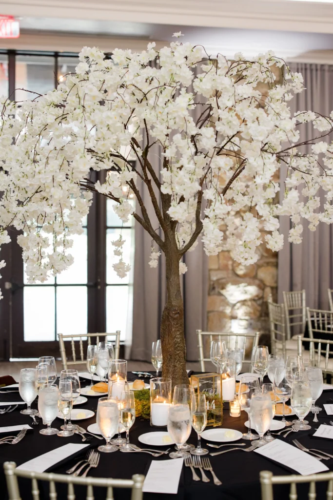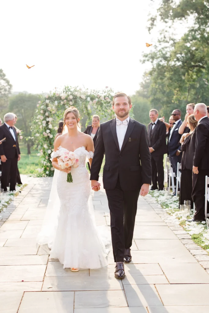 Meg wanted “a European country stone cottage-feel” and found exactly that in Fiddler’s Elbow. With an “edgy elegant” style in mind, the couple settled on a black-and-white palette, with pale pink flowers and gold accents.
