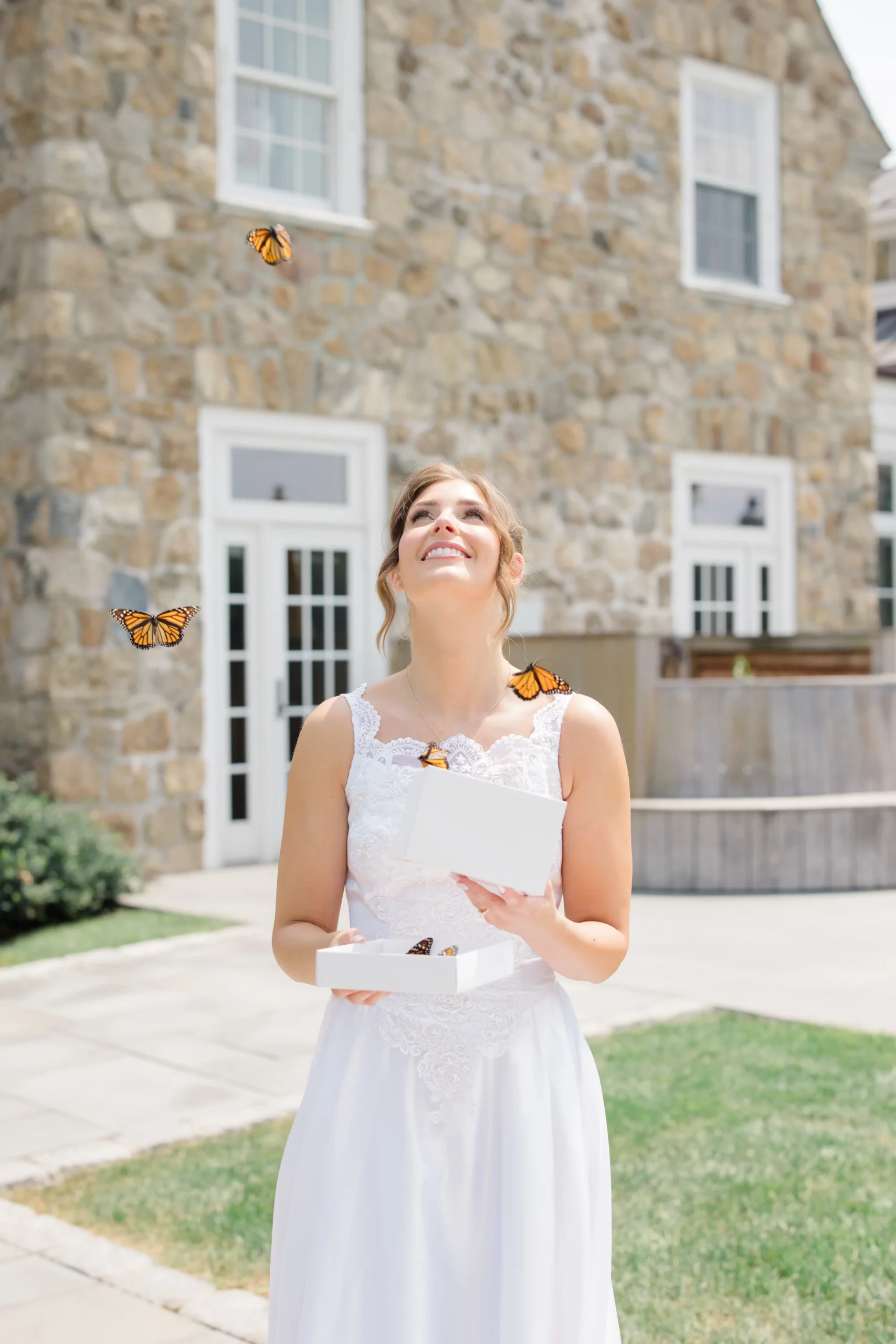 A solitary monarch butterfly lingered after the ceremony butterfly release. It followed Meg into the venue, and stayed the whole night. “The wedding coordinator said, ‘This is definitely your mother,’” Meg recalls.