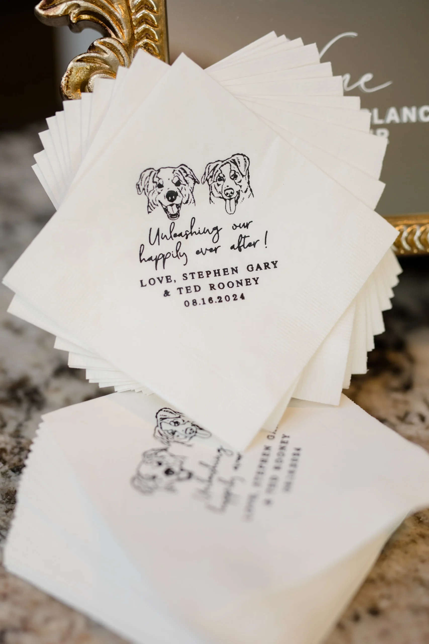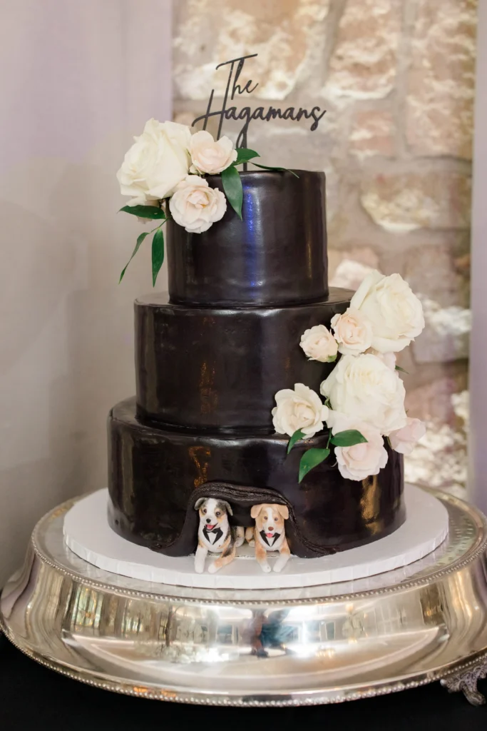 Large flowering trees enhanced the space. For their August 16, 2024, wedding, the dress code was black tie, and the wedding party was all in black—as was the wedding cake, which featured figurines of the couple’s dogs, Stephen Gary and Ted Rooney.