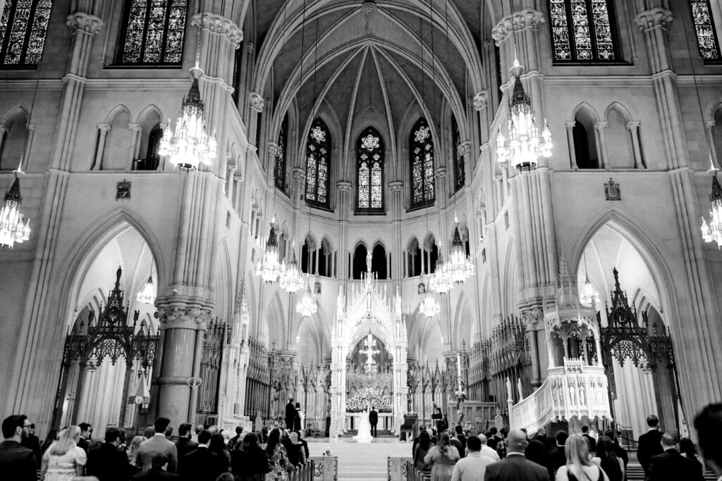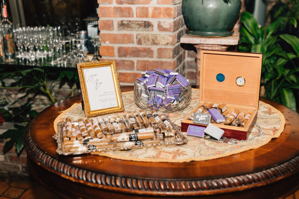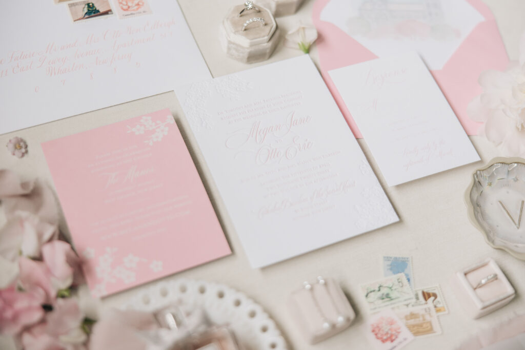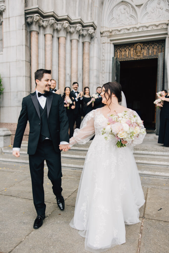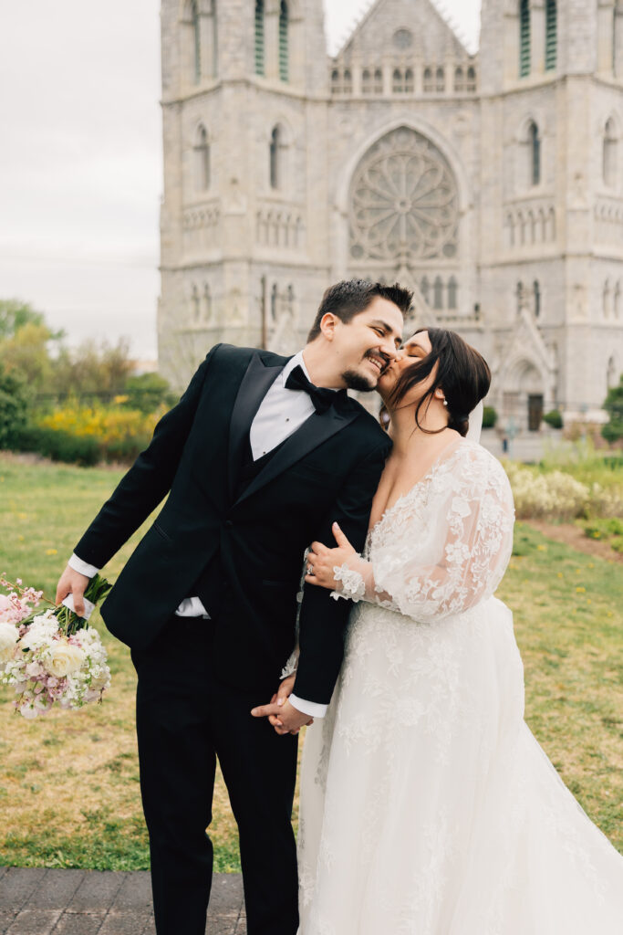 For their April 15, 2023 ceremony, the couple chose the Cathedral Basilica of the Sacred Heart in Newark, “because we used to drive through Branch Brook Park during quarantine and look at the cherry blossoms,” says Megan. “We stumbled upon the beautiful church during one of our drives and I said, ‘I need to get married here!'” It is simply breathtaking. We chose a date in April so we could utilize the Easter flowers in the Cathedral, as well as the peak cherry blossom blooms in the park. My bouquet and wedding invitations incorporated cherry blossoms to tie it all together. We had a classic formal black-tie wedding, with the bridesmaids in black off the shoulder gowns and the groomsmen and groom in black tuxedos. I wanted a very timeless look. Otto and I love to smoke cigars, so our favors were cigars with personalized stickers and custom matchboxes.”