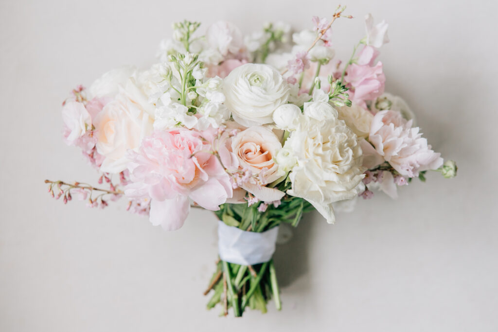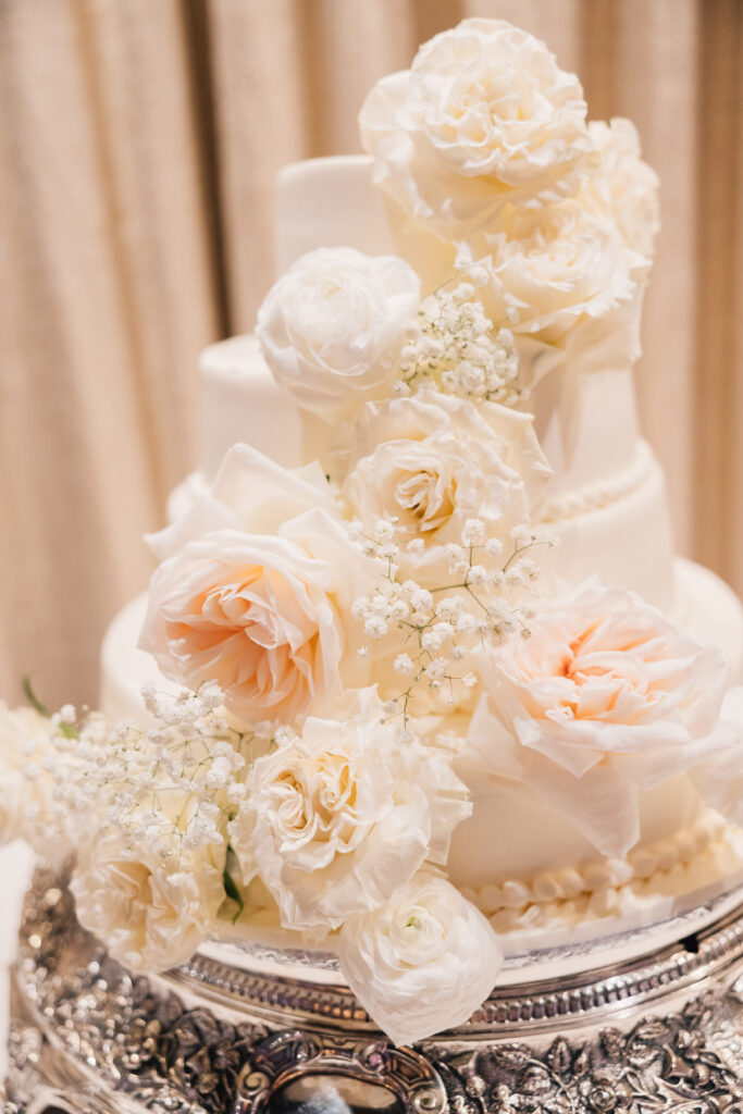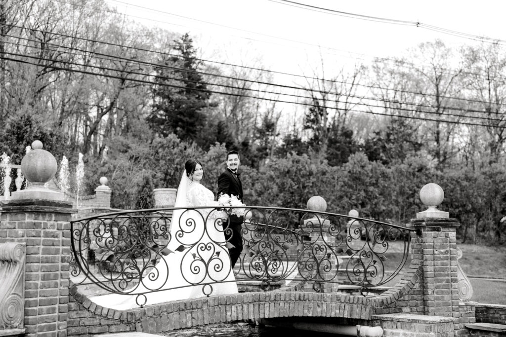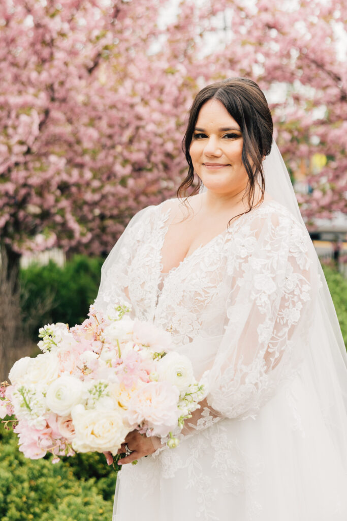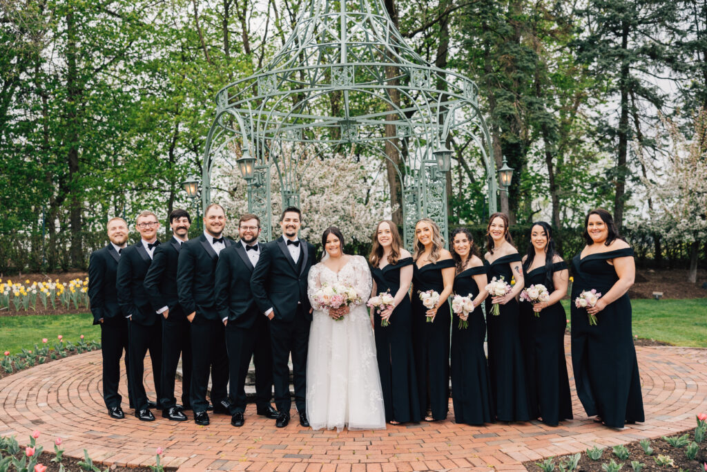 A timeless black-tie affair with pops of cherry blossoms! Megan and Otto chose the Cathedral Basilica of the Sacred Heart in Newark for their April ceremony. “We used to drive through Branch Brook Park during quarantine and look at the cherry blossoms,” says Megan. “We stumbled upon the beautiful church during one of our drives and I said, ‘I need to get married here!'” Their wedding at the Manor, one of the last at the longtime venue before it permanently closed in July, featured black ensembles for the bridal party, funfetti cake and cigar favors.“The grounds and overall vibe of the venue were perfect for us—classic, vintage and historical,” says Megan.