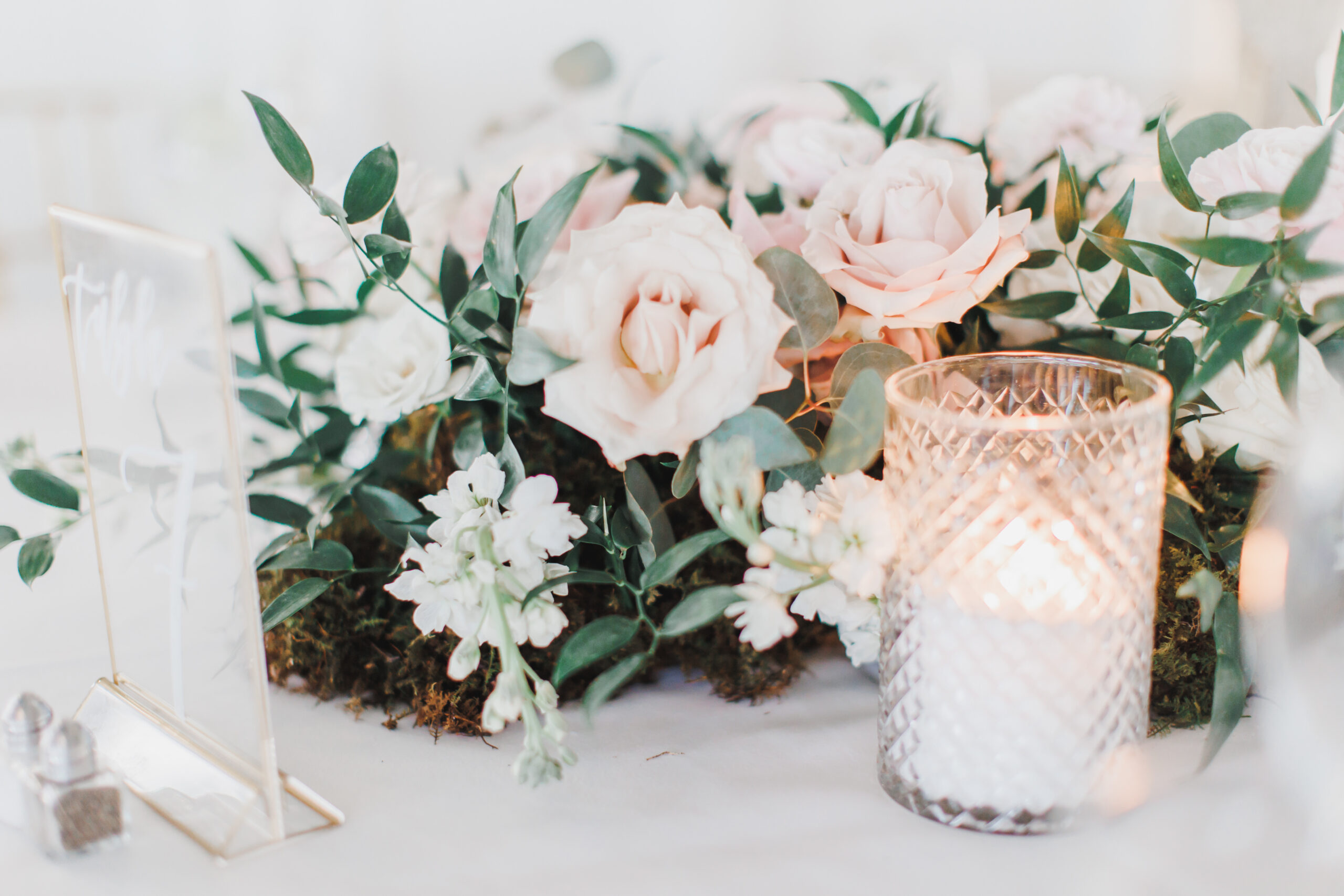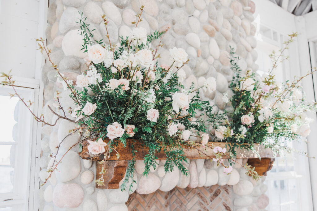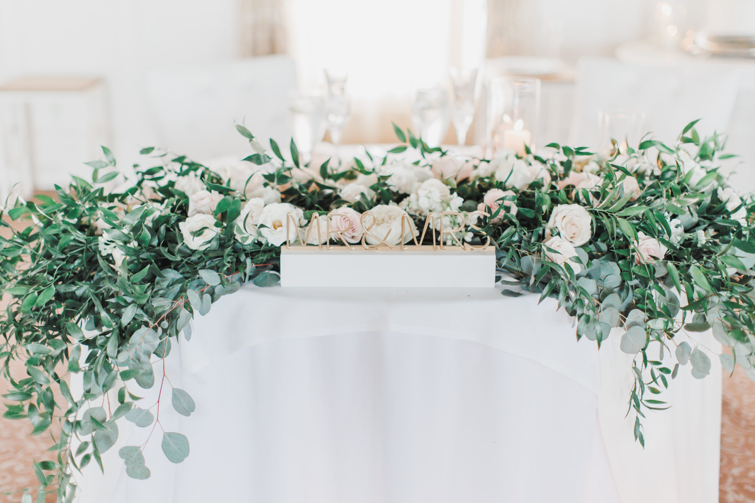 Mia envisioned a romantic, airy vibe, incorporating the colors ivory, white, sage green and a pop of pale pink. They also utilized a lot of candles to really bring the romantic vibe to life.
