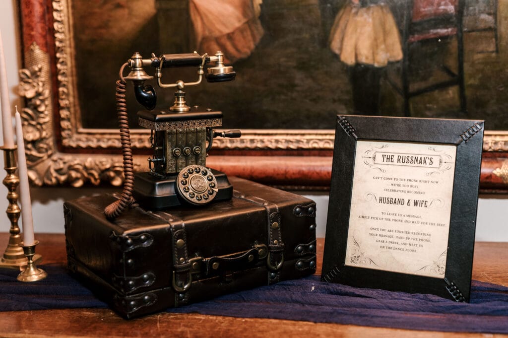 The couple rented the Steampunk Fete Fone for their guest book.