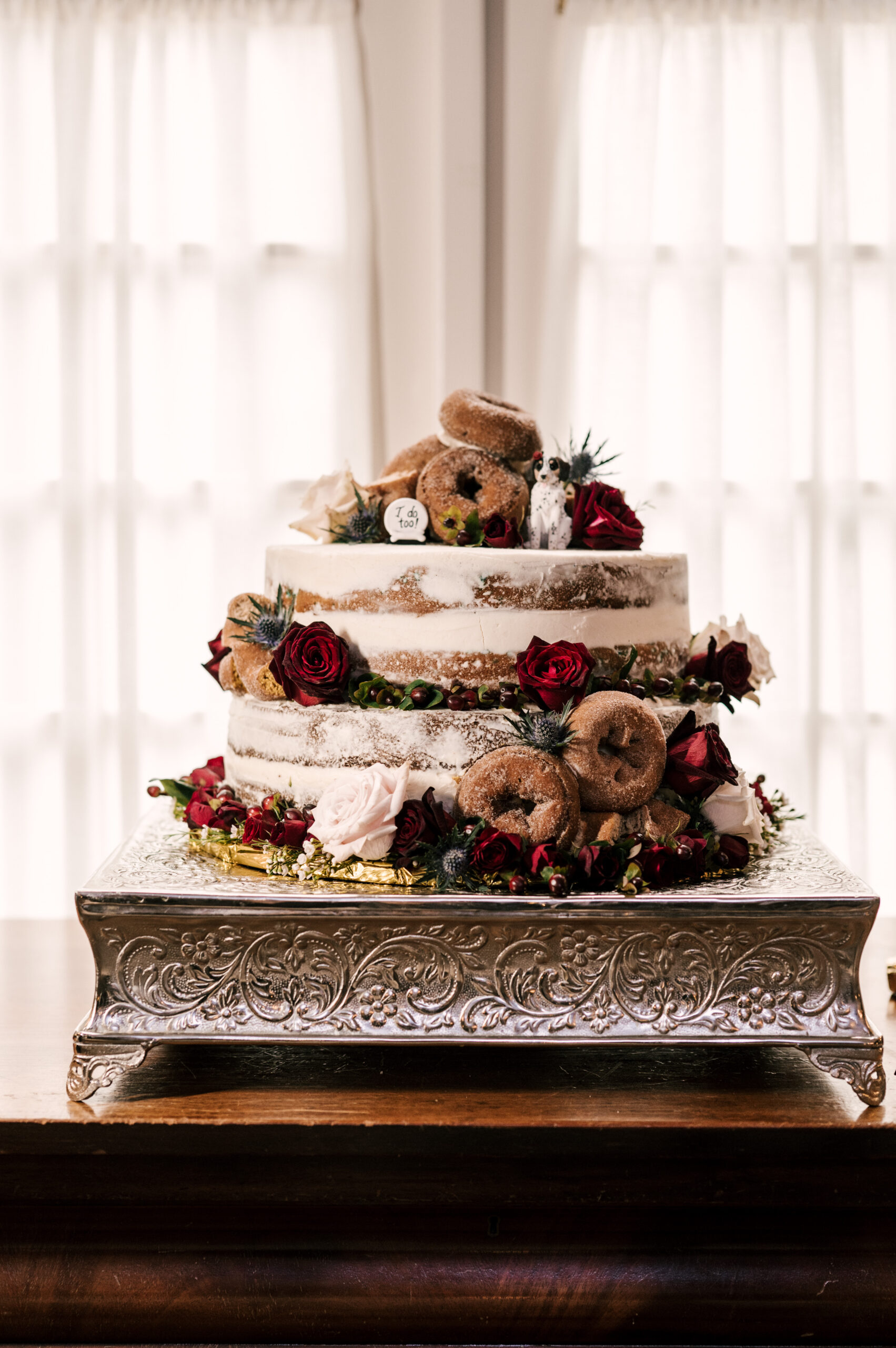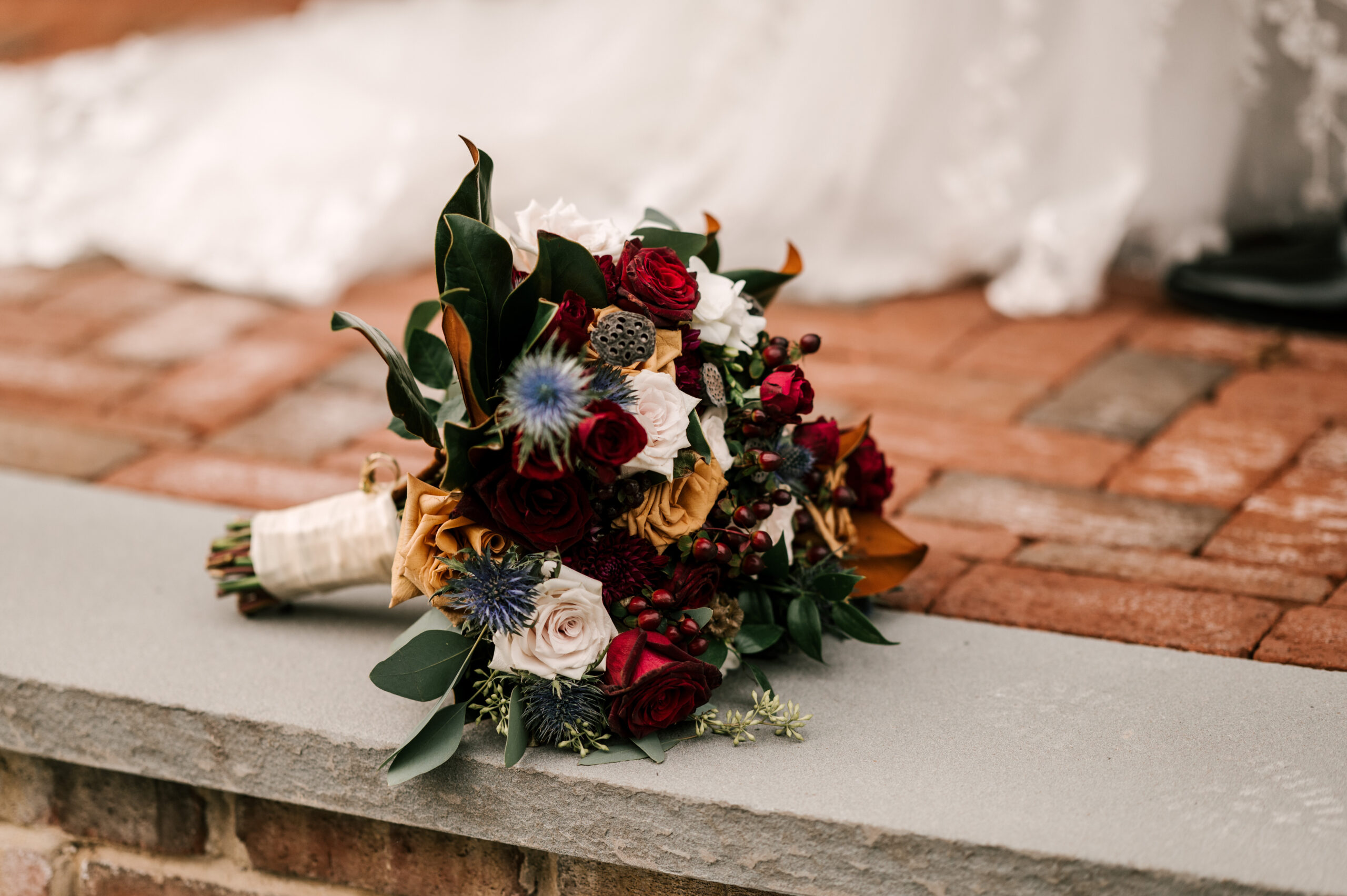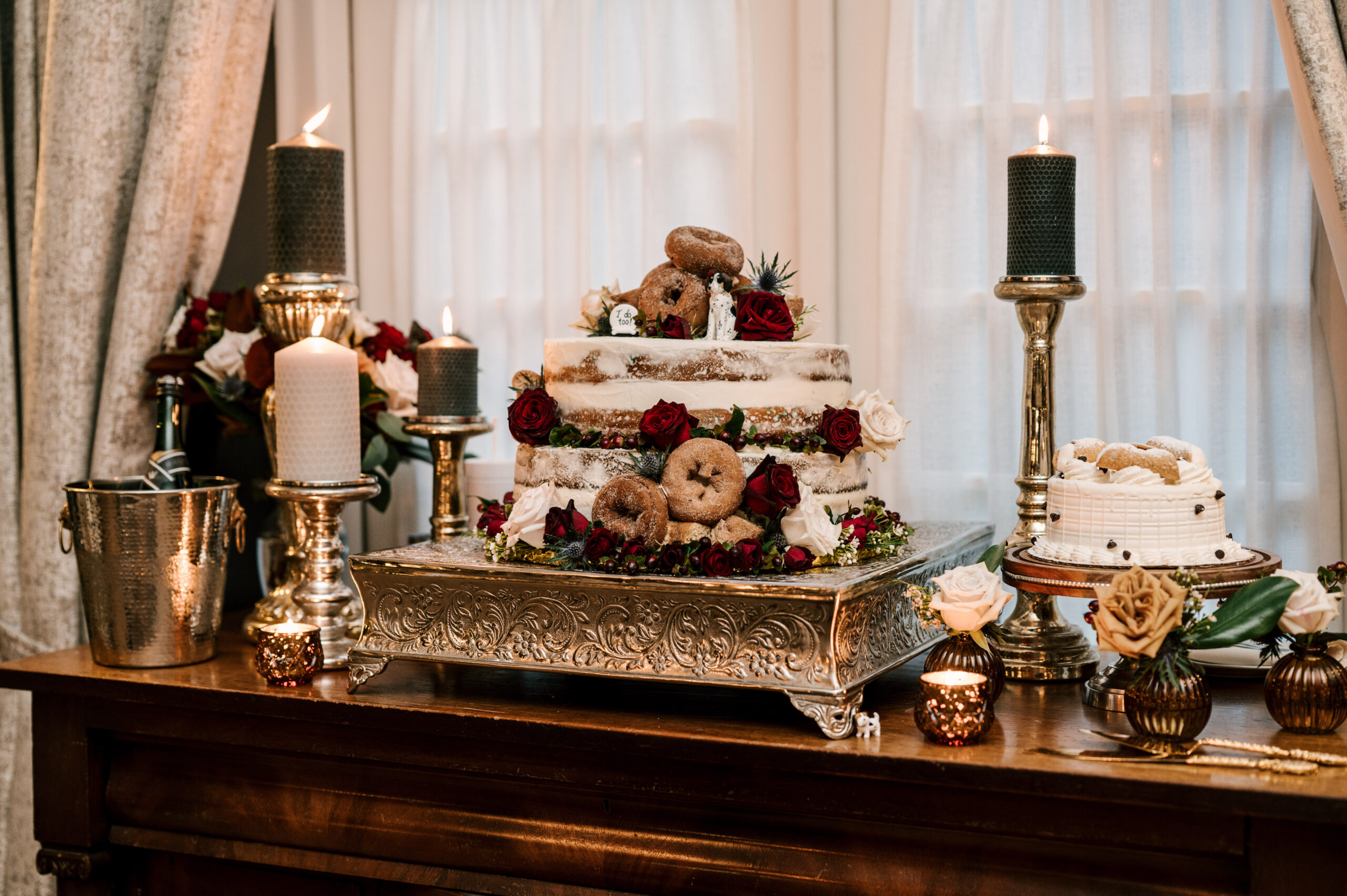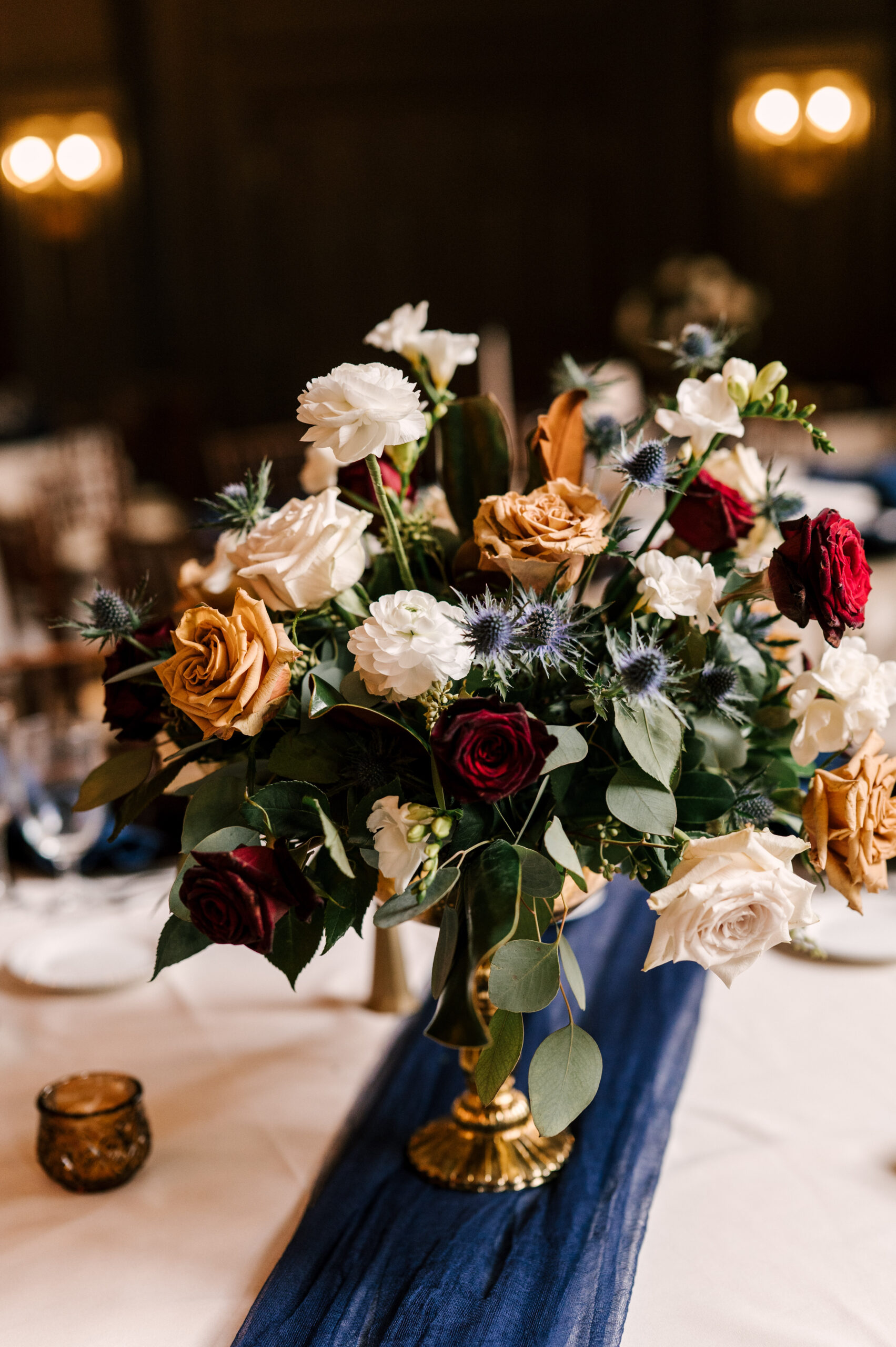 Hints of gold brass, navy and burgundy were used throughout the wedding.