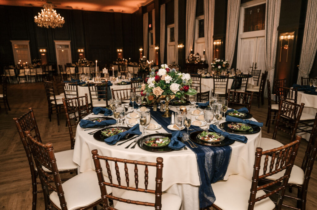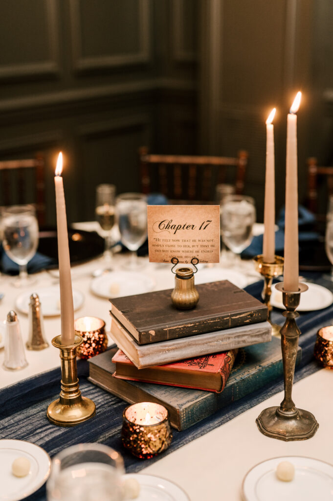Every table had a navy cheese-cloth table runner, burgundy chargers, navy napkins and table numbers that looked like a chapter from a book with a famous quote about love.