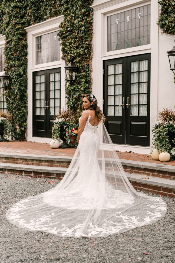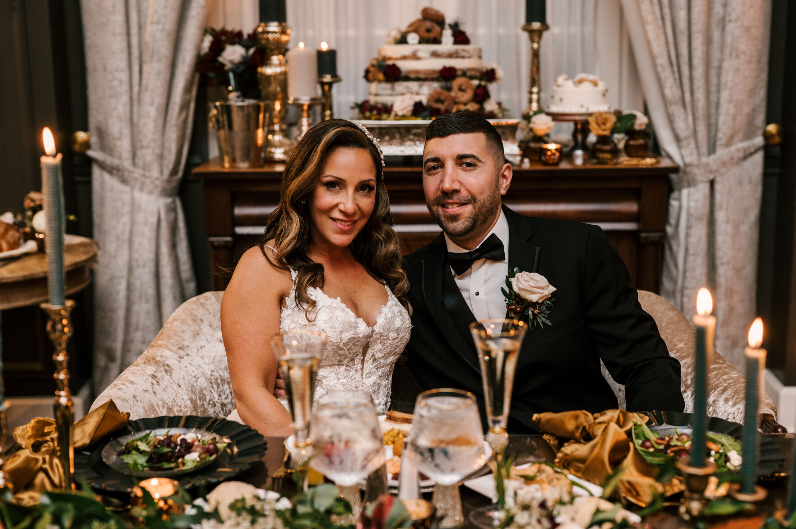 The couple chose a “dark and moody theme since our wedding was being held in October and felt that fit the season and the vibe we were going for,” says Nicole. “We wanted the reception room to feel dark and moody like an old love story,” she adds.