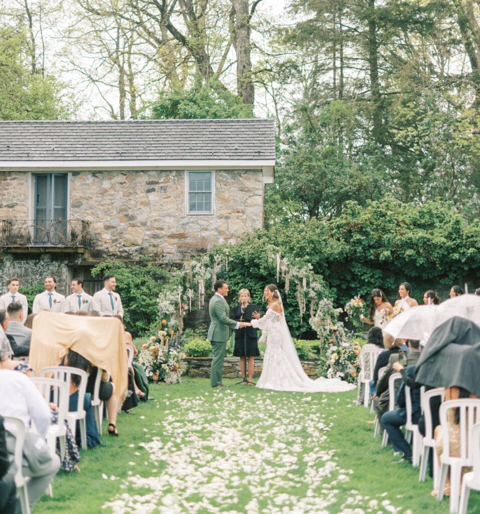 It began to rain just before their ceremony. The guests were moved under a covered area and they waited it out until the showers slowed to a drizzle.